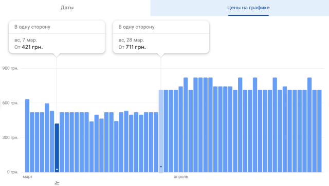 Квиток на прямий рейс «Київ-Херсон» коштує 720 грн, якщо бронювати за місяць (на 31 березня). Вартість квитка на рейс «Київ-Івано-Франківськ» стартує від 720 грн до 1691 грн (запуск сполучення – з 18 березня). Ціна за квиток на рейс «Київ-Запоріжжя» – 1107 грн при бронюванні не раніше, ніж за два тижні наперед.