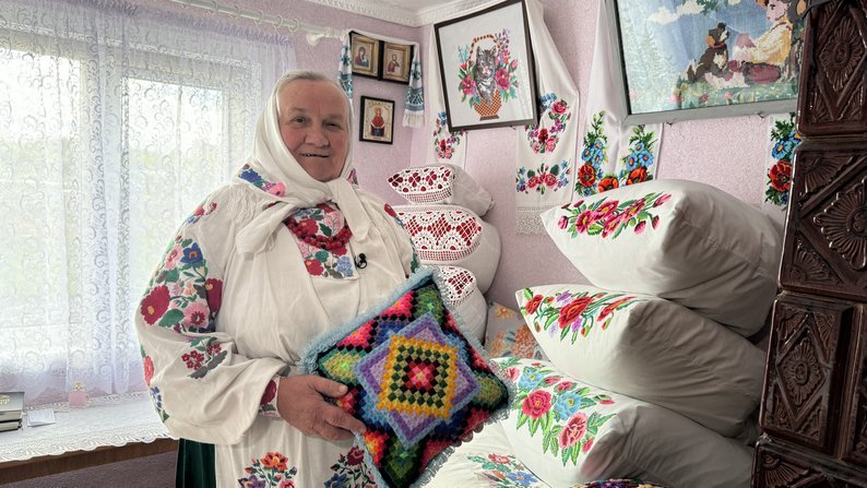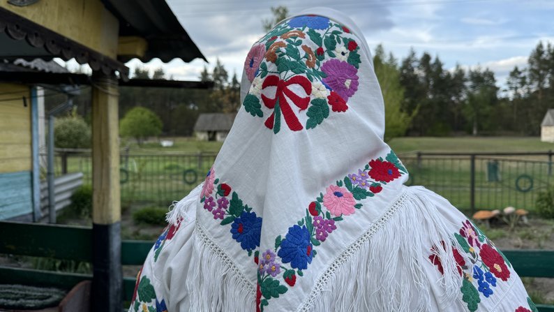 «Це все мамина ручна робота. Матеріал на хустку привіз дядько з Німеччини, бо він у Другу світову війну дійшов туди. Як їхав назад, привіз такого матеріалу, то мамі вділили на хустку. Я не знаю скільки, але вона скоро робила, скоро вишивала все гладдю, і то на два боки», – каже Ніна Поліщук.