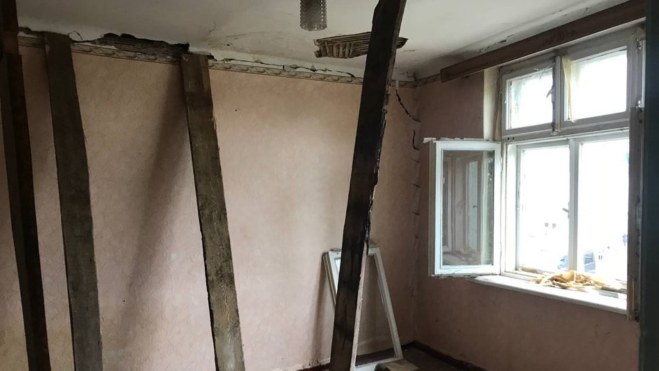 Руйнувань також зазнали дві квартири на другому поверсі. Наразі стеля підперта розпірками, підлога перехилилась. Між дахом і стіною, що просіла, – діри.Після руйнування фасаду одну стіну квартири розібрали повністю, щоб зменшити навантаження та уникнути повного обвалу.