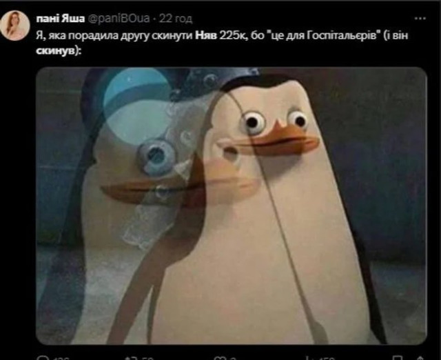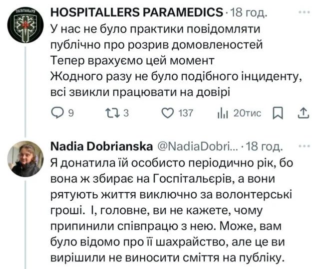Ви або дуже наївна. або, вибачте. не дуже розумна людина, якщо не розумієте, що в часи великих потрясінь: воєн, революцій, реформувань і тому подібного, різноманітні пройдисвіти, шахраї, злодії якраз і активізуються, адже отримують можливість легко заволодівати коштами, отримувати посади та інші блага при менших шансах нести за це покарання. А в даному випадку безвідповідально поводили себе "Госпітальєри". Невже не знають, що частина людей "волонтерить" у власну кишеню? Чому не звертали ніякої уваги на контроль діяльності своїх представників? "Все було на довірі..." - це якась дитяча позиція. То яке покарання Ви хочете щоб понесла вказана особа, якщо самі "Госпітальєри" не знають скільки коштів від їх імені видурила ця панів Няв? Закон так не працює. Має бути чіткий розмір збитків, заподіяних медбату, бо Няв заявить, що ніяких коштів, призначених "Госпітальєрам", їй не надходило і на неї "списують" розтрати інші представники цієї організації