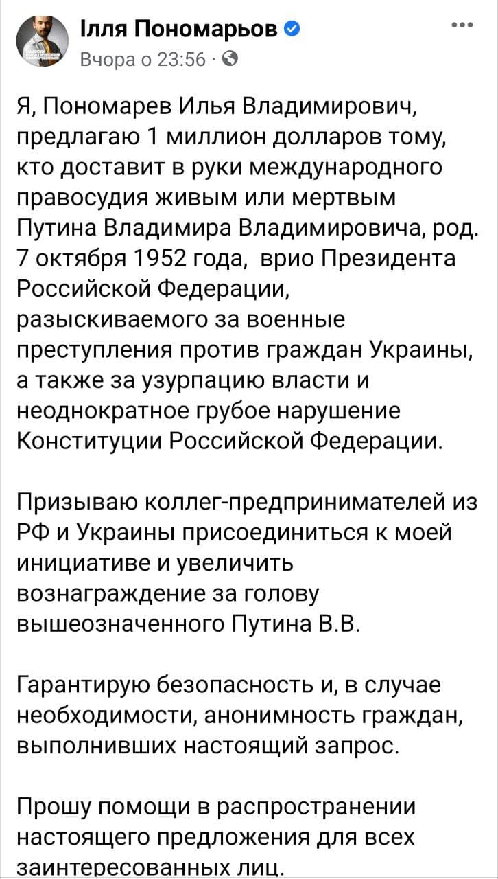 «Я, Пономарьов Ілля Володимирович, пропоную $1 млн тому, хто доставить до рук міжнародного правосуддя живим або мертвим Путіна Володимира Володимировича, який народився 7 жовтня 1952 року, президента Російської Федерації, розшукуваного за військові злочини проти громадян України, а також за узурпацію влади та неодноразове грубе порушення конституції Російської Федерації. Гарантую безпеку і, у разі потреби, анонімність громадян, які виконають цей запит», – заявив Пономарьов.До ініціативи почали долучатися й інші бізнесмени та організації, зокрема у благодійній організації «Час дій» запропонували об’єднати зусилля і додати ще три мільйони.