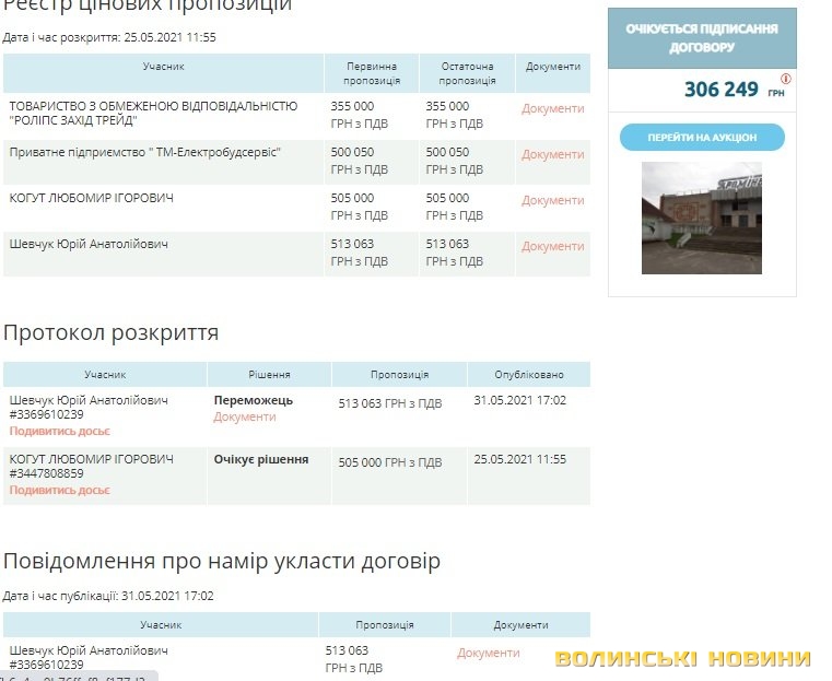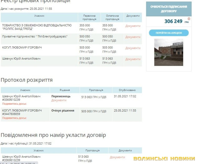 Стартова ціна лоту була 306 349 гривень, а придбали його за 513 063 гривні. Переможцем визнаний учасник Шевчук Юрій Анатолійович, який і запропонував найвищу ціну.Читати ще: Розвалюхи за мільйони: як на Волині продають старі приміщення і чому відмовляються переможці