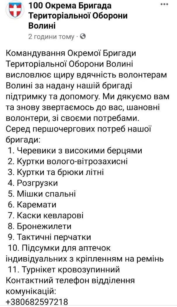«Командування Окремої Бригади Територіальної Оборони Волині висловлює щиру вдячність волонтерам Волині за надану нашій бригаді підтримку та допомогу. Ми дякуємо вам та знову звертаємось до вас, шановні волонтери, зі своїми потребами», – йдеться у повідомленні.