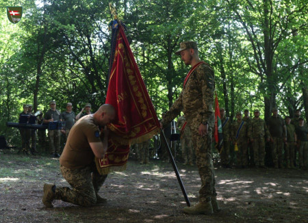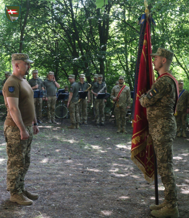 Командир 14 окремої механізованої бригади імені князя Романа Великого полковник Олександр Охріменко в районі ведення бойових дій попрощався з Бойовим прапором військової частини.