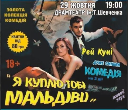 Київський театр «Тисячоліття» презентує у Луцьку комедію Рея Куні «Я куплю тобі Мальдiви». Показ відбудеться 29 жовтня о 19.00 в облмуздрамтеатрі.
