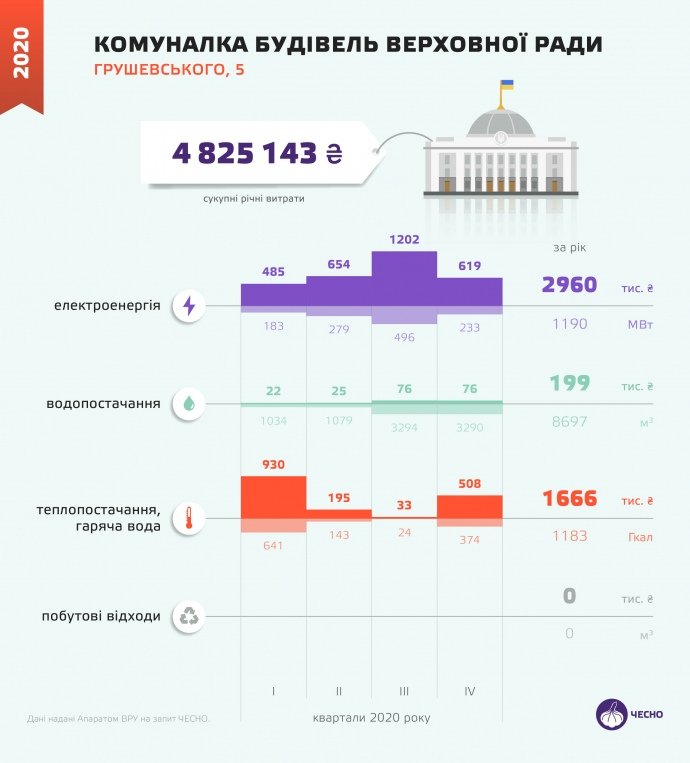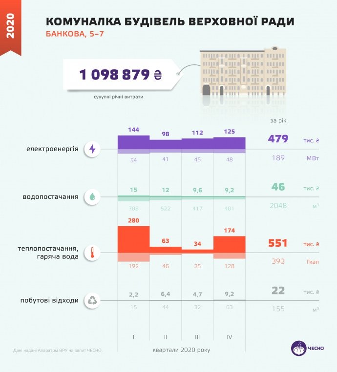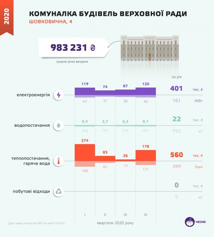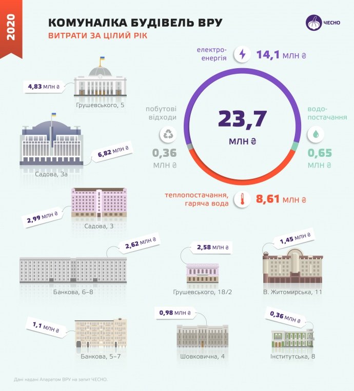 Далі, відповідно до сум у платіжках, будівля за адресою Садова, 3. Там розташовані секретаріати депутатських фракцій та частина Апарату Ради. Всього торік за житлово-комунальні послуги держава заплатила понад 2,9 млн.Будинок на Банковій, 6-8, де розташовані також частина апарату і частина комітетів, споживає послуг на понад 2,6 млн.Будівля, яка перебуває на балансі у ВР за адресою Грушевського, 18/2, де зазвичай відбуваються засідання комітетів і фракцій, споживає трохи менше. Сума за житлово-комунальні послуги – понад 2, 5 млн.Близько 1,5 млн держава заплатила за комуналку у будівлі за адресою вулиця Велика Житомирська, 11, де розміщується частина Апарату ВР і комітетів.Близько 2 млн витрачають в будівлях на Банковій, 5-7 (1,1 млн) і на Шовковичній, 4 (0,98 млн).Найменше Верховна Рада споживає комуналки у будівлі на вулиці Інститутська, 8. Торік держбюджет оплатив там комуналки на майже 360 тис.Загалом Управління адміністративними будинками Апарату ВРУ зазначило, що заходи з підвищення енергоефективності будуть проводити під час реконструкції цих будівель. Однак поки її не планують. Тому за 2020 рік держбюджет заплатив комуналку в Раді на загальну суму близько 23 мільйони 700 тисяч гривень.