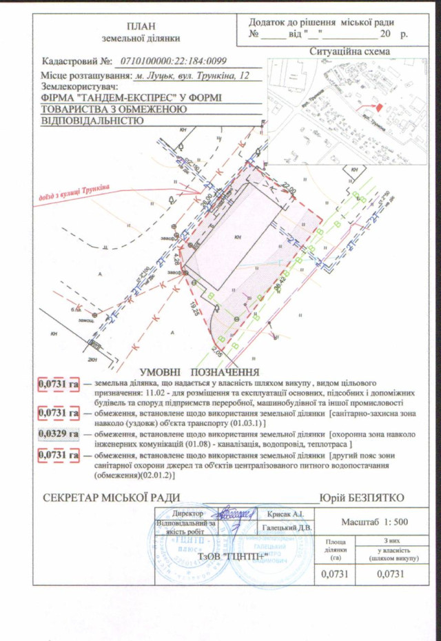 Це ділянка площею 0,0731 га, кадастровим номером – 0710100000:22:184:0099, видом цільового призначення – для розміщення та експлуатації основних, підсобних і допоміжних будівель та споруд підприємств переробної, машинобудівної та іншої промисловості.