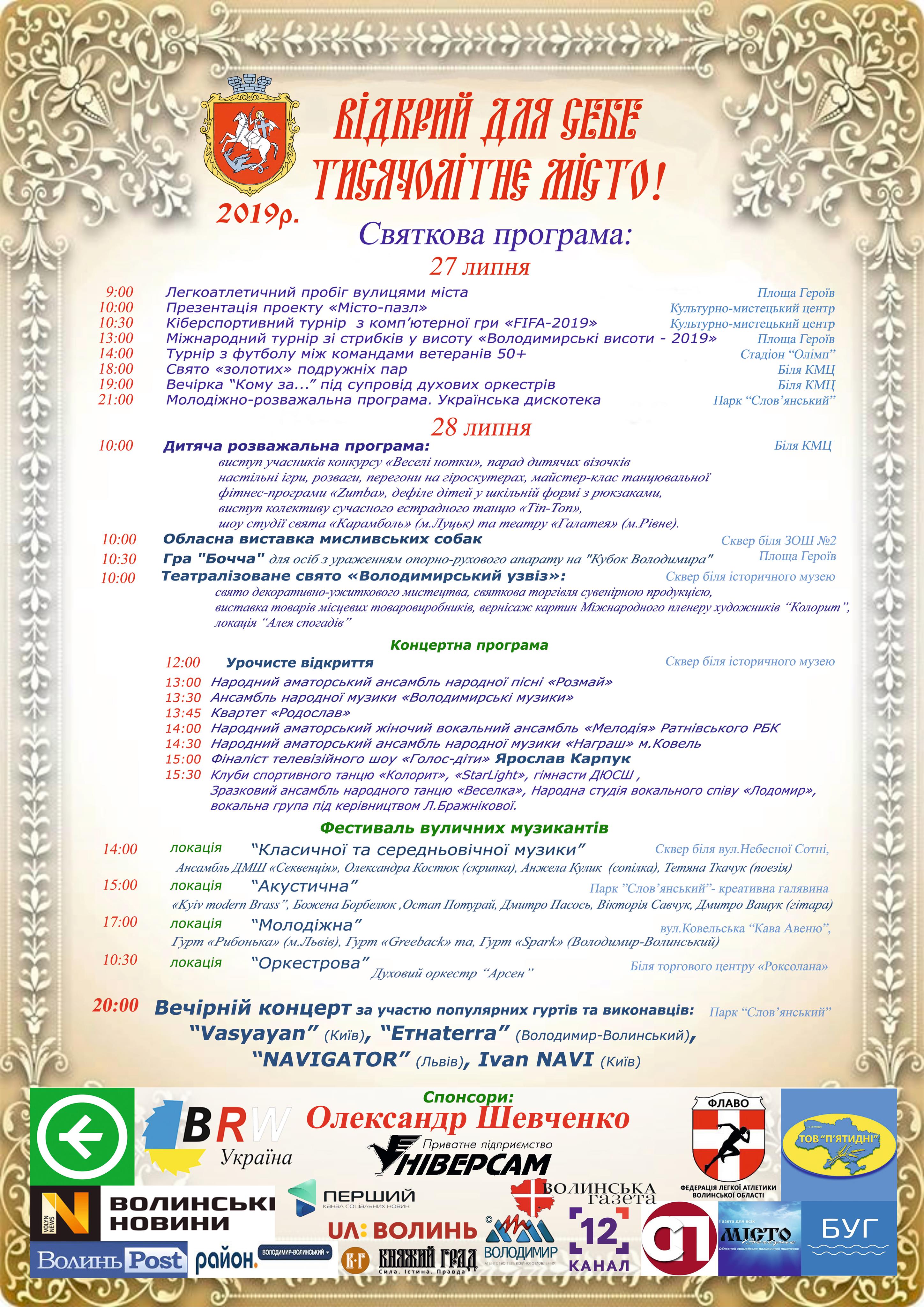 27-28 липня древній Володимир-Волинський відзначатиме свій день народження. Цьогоріч княжому місту виповнюється 1031 рік. Мешканців та гостей міста очікують яскраві конкурси, спортивно-ігрові заходи, організація дитячих розваг, концерти художніх колективів, а також виступи естрадних виконавців та гуртів, ансамблів та оркестрів, офіційне привітання міського голови та урочисті нагородження найкращих.