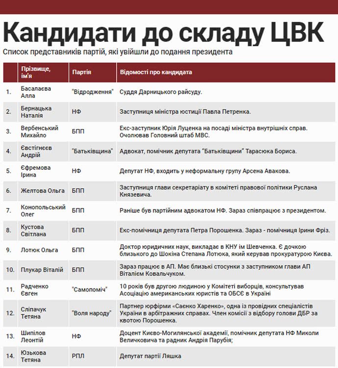 Разом з тим, потрапляння представника партії в подання президента ще не означає призначення в ЦВК. Виглядає так, ніби в Порошенка є "домашня заготовка": як, з одного боку, не пустити небажаних кандидатів у Центрвиборчком, а з іншого – зняти з президента відповідальність за це.