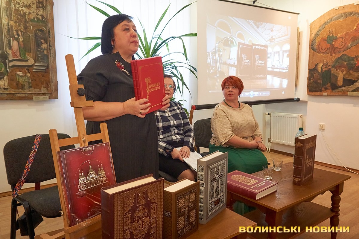 Поява на світ факсимільних видань (таких, що максимально відтворюють усі особливості оригіналу) стала можливою завдяки київському видавництву «Горобець». Ентузіазм його співробітників та відданість улюбленій справі засновниці й директорки Ганни Горобець призвели до започаткування у 2009 році програми «Повертаємо в Україну культурну спадщину».Головним завданням проєкту Ганна Горобець бачить відродження інтересу до унікальних пам’яток української культури, які, на жаль, перебувають за межами держави. Нині ж у Музеї волинської ікони директорка видавництва «Горобець» з гордістю демонструє чудові факсимільні видання книг, які без перебільшення можна називати шедеврами.Захід розпочала директорка музею Тетяна Єлісєєва. Вона представила присутнім гостей, завдяки яким усі, хто цікавиться Словом Божим і з позицій віри, і з наукової точки зору, мають змогу вивчати унікальні книги. Не варто забувати і про те, що першоджерела свідчать: тогочасна Україна була надзвичайно розвиненою, а українська мова є не лише давньою, а й самостійною.Менеджер проєкту Діана Шамрай підкреслила: волинська земля має своєрідну магію. Адже реалізація задумів розпочиналася саме тут, і після довгих років важкої праці нині випала чудова нагода презентувати спільне надбання.Ганна Горобець більш детально зупинилася на історії друку представлених видань. Як з’ясувалося, дуже багато зусиль вимагає підготовчий етап: пошук інформації про книгу, її місцезнаходження, можливість працювати з оригіналом. Розповіла директорка видавництва й про те, чому взялася за такий особливий сегмент літератури – факсимільні видання.У 2006 році вона як туристка відвідала Реймський собор і там побачила Євангеліє Анни Ярославівни – доньки Ярослава Мудрого. До речі, існують легенди, що саме на цій книзі присягали монархи Франції під час коронації. Коли Ганна Горобець роздивлялася раритет під склом (це, виявляється, також факсимільна копія!), у неї народилася мрія. Жінка пообіцяла собі, що ця книга повернеться до України. І за три роки – у 2009-му – виник проєкт «Повертаємо в Україну культурну спадщину».Теплими словами згадує Ганна Горобець і тих, хто надає підтримку такій потрібній, але дорогій справі. Сьогодні це родини, компанії, меценати. Один з них – директор благодійного фонду «Українська рукописна книга» Ігор Артемчук – був сьогодні серед гостей заходу. А тоді – у 2009 році – значну підтримку молодому проєкту надав митрополит Луцький і Волинський Нифонт. Адже два перші видання було виконано у тісній співпраці з ним.