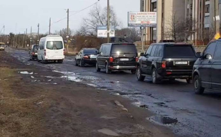 Автомобілям з кортежу президента Петра Порошенка довелося мінімально знизити швидкість через ями на місцевих дорогах.