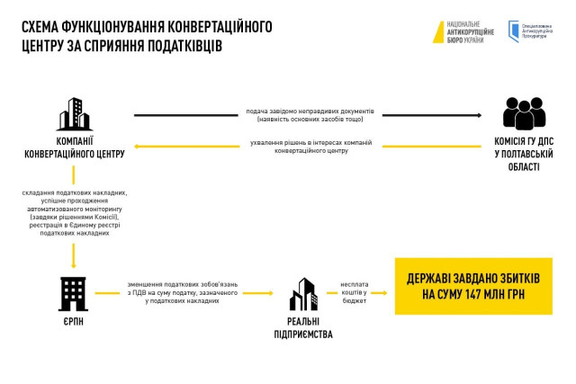 Слідство встановило, що тогочасний в.о. голови Державної податкової служби України сприяв безперешкодній діяльності конвертаційного центру, а заступниця начальника Головного управління ДПС у Полтавській області, яка очолювала комісію з питань зупинення реєстрації податкових накладних, забезпечувала ухвалення рішень на користь компаній конвертаційного центру.