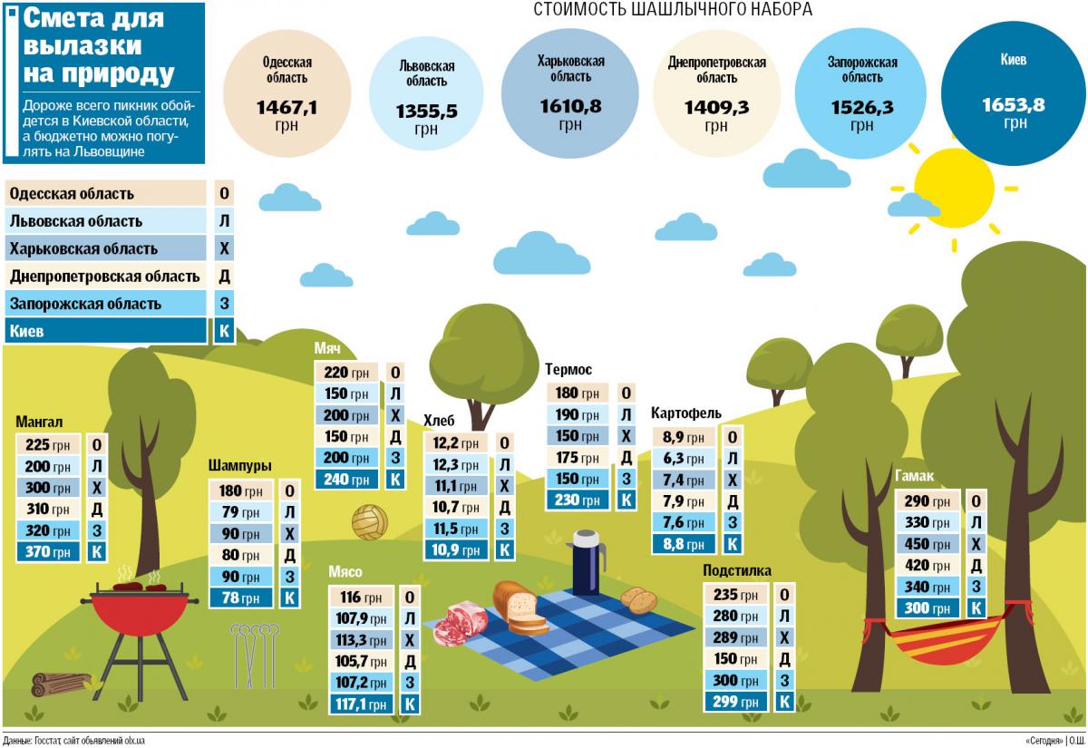 Ціни на ці товари по всій країні приблизно однакові і не змінилися з минулого року. З урахуванням цих додаткових витрат, якщо весь інвентар для відпочинку у вас вже є, мінімальний пікнік без алкоголю обійдеться в середньому 178 грн за регіонами. Якщо ж вам ще необхідно придбати інвентар, то пікнік обійдеться майже в 10 разів дорожче. Так, у Київській області, щоб виїхати на шашлики, доведеться витратити 1654 гривні. Найдешевше буде відпочити в Одеській області - 1467 гривень.