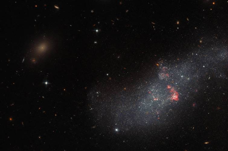 На знімку зображена мініатюрна галактика UGCA 307 в сузір’ї Вора на фоні далеких галактик.
