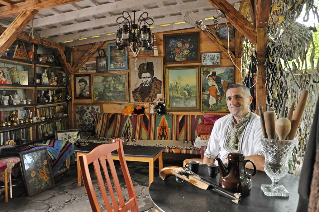 Уламки старої плитки утворили барвисту мозаїку, що у променях сонця по-особливому виграє візерунками. Ця шедевральна доріжка плавно переходить у дерев’яний килим із вставками скляних пляшок в наступну ділянку, що вже під накриттям і відділяється від першої тільки стіною з маскувальної сітки. Тут мікс усіх часів: перші телефони, раритетні годинники, сервізи, посуд і статуетки різних епох, а також вишиті й мальовані картини квітів, пейзажів, сюжетів українських вечорниць тощо.Але головний серед них – громіздкий на фоні решти портрет Шевченка. А на полицях поряд – десятки, може, й сотні книг. Серед них, звісно, «Кобзар». На автентичних лавах і стільцях, встелених в’язаними й тканими ряднами, можна відпочити за горнятком кави-чаю й зануритись у літературу на свій смак. У разі відсутності електроенергії підсвітити можна гасовими лампами.
