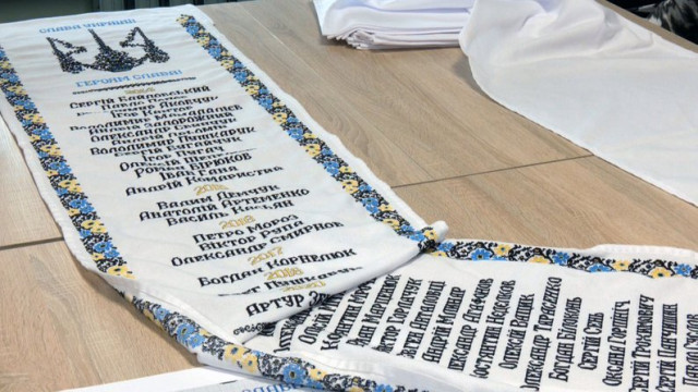 У Нововолинську продовжують вишивати 20-метровий «Рушник Пам’яті». Уже готова третину виробу. Загалом на полотні має бути 150 імен та прізвищ загиблих з Нововолинської громади захисників.