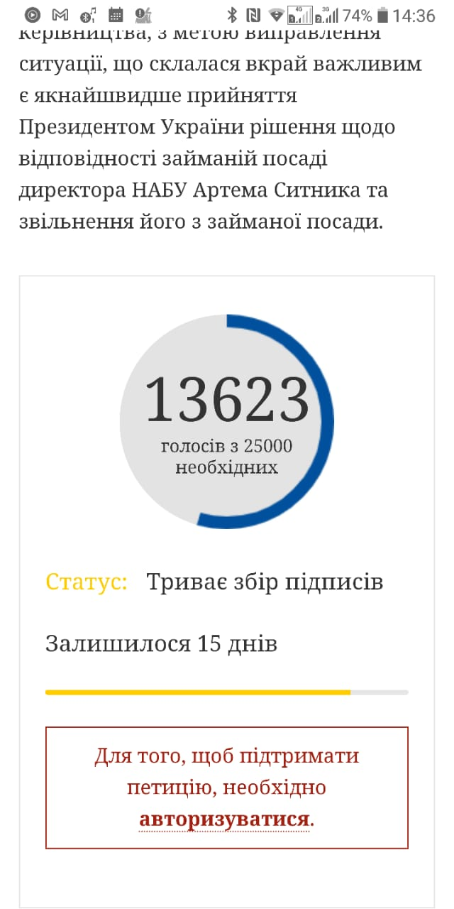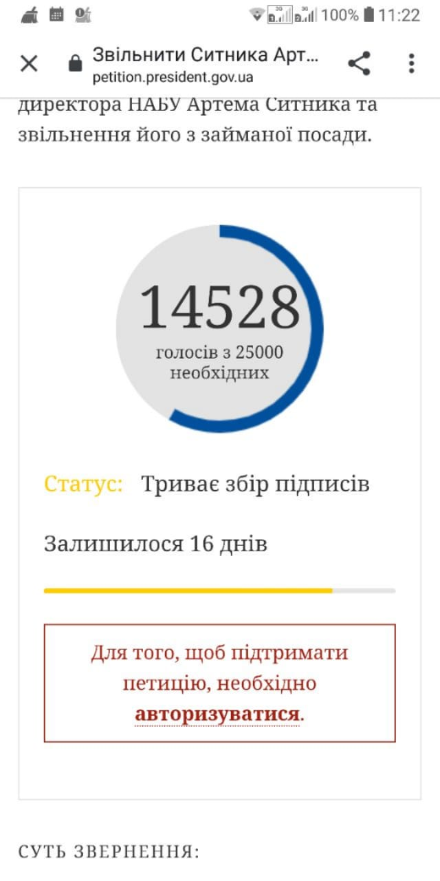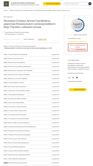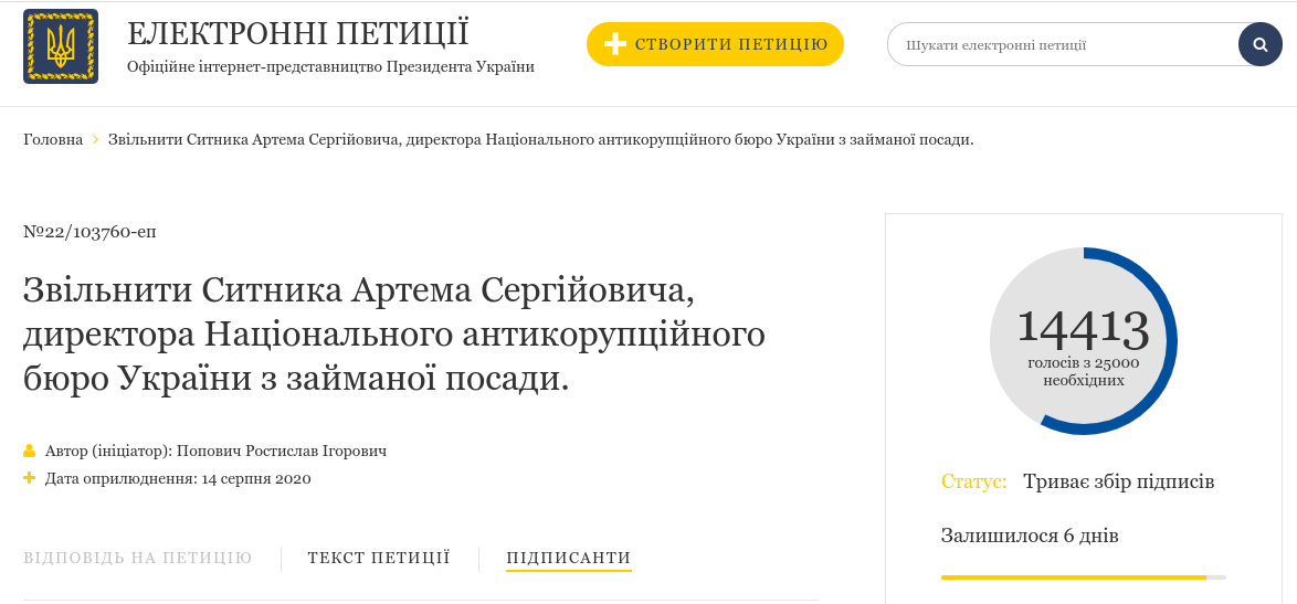 Йдеться про петицію на сайті президента № 22/103760-еп «Звільнити Ситника Артема Сергійовича, директора Національного антикорупційного бюро України з займаної посади». Станом на сьогодні зареєстровано 26 008 голосів тих, хто підписав петицію.