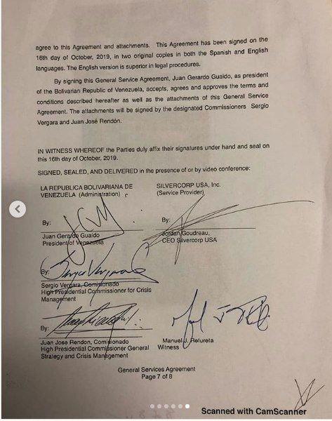 В цей же час в мережу потрапили кадри спорядження бійців і нібито договір про надання військової підтримки перевороту між ПВК і лідером опозиції Хуаном Гуайдо на суму 213 мільйонів доларів.Затримання ПВК SILVERCORP у Венесуелі і нібито договір між Гудра і ГуайдоХуан Гуайдо не прокоментував подію, але раніше заявляв, що не підписував жодних контрактів про військову підтримку.