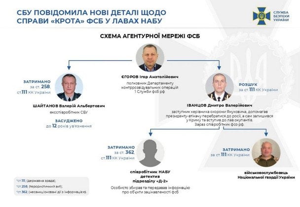 В СБУ звернули увагу, що інший агент мережі Єгорова-Іванцова – Шайтанов – уже отримав вирок у вигляді 12 років ув’язнення. Щодо посадовця Нацгвардії, то він наразі перебуває під вартою.