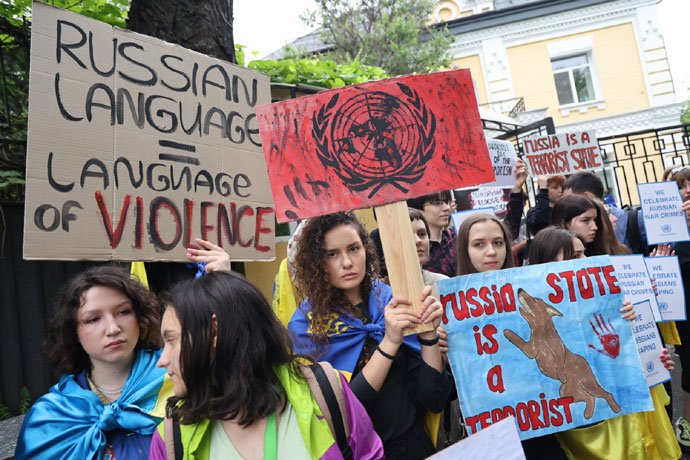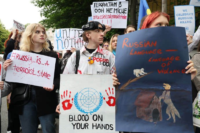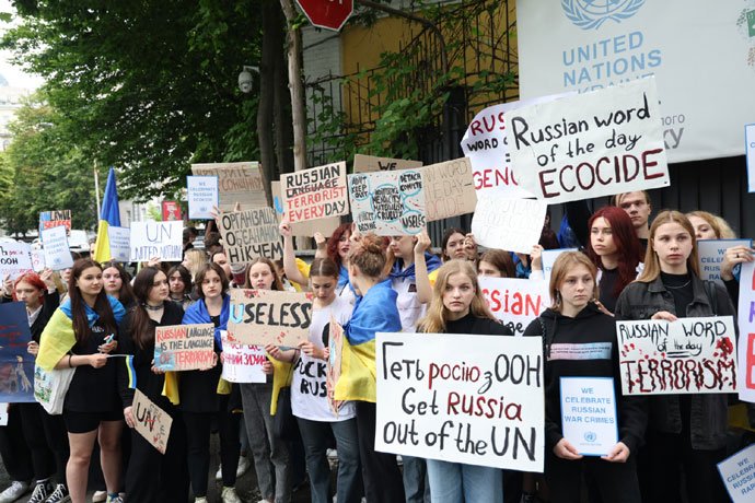 Учасники акції скандують «Ганьба» і «Геть Росію з ООН». Вони також скинули російськомовні книжки біля входу до Офісу ООН.Люди тримають плакати з написами англійською та українською: «Росія − терористична держава», «ООН, кров на ваших руках», «Російська мова − мова насильства», «Зупиніть екоцид», «Терористам в ООН не місце», «Організація об’єднаних нікчем», «Мовчання − підтримка тероризму».Акція проходить мирно, жодних сутичок наразі немає, на місці присутні правоохоронці.