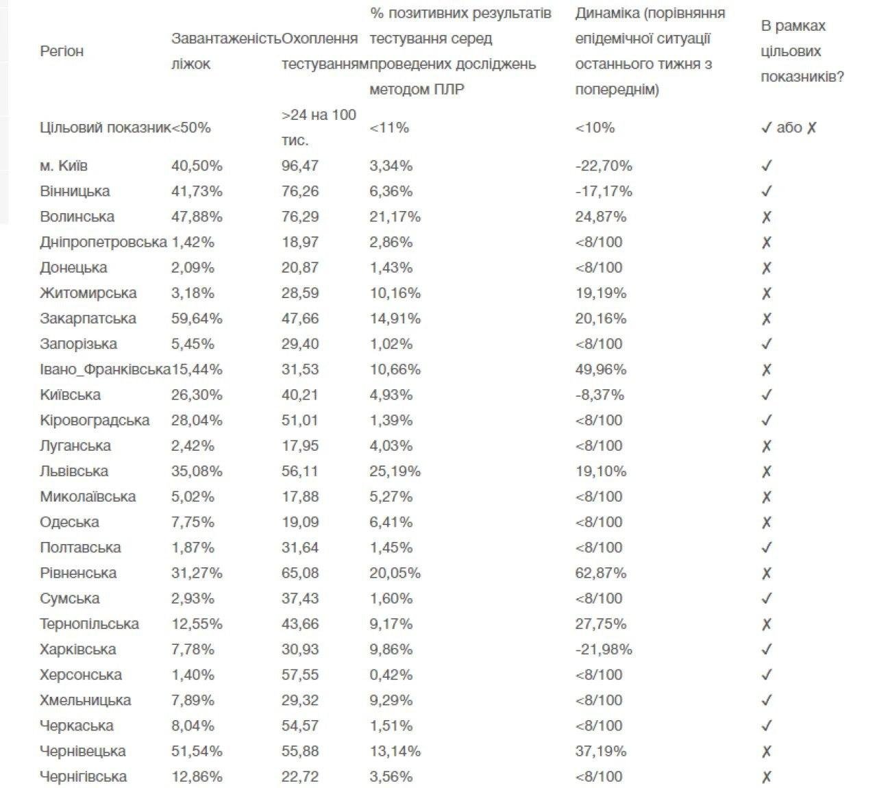 Останні дві не відповідають відразу декільком критеріям: негативна динаміка зростання нових випадків там перевищує 10%, а завантаженість ліжок — понад 50%.