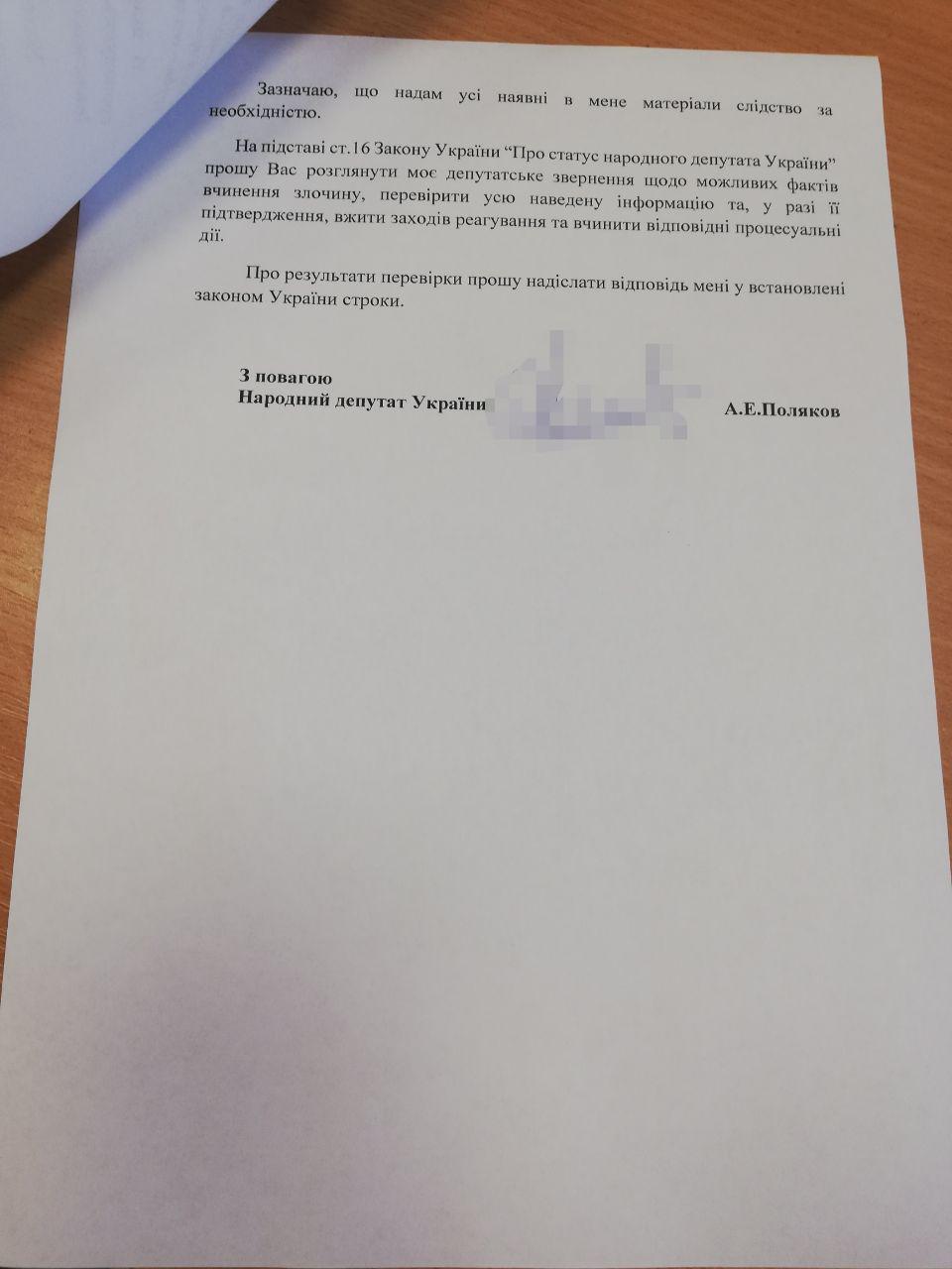 Народний депутат Антон Поляков звернувся в ДБР і НАБУ із заявою про необхідність перевірки щодо можливого скоєння злочину деякими членами фракції «Слуга народу». Про це Поляков повідомив Страні і показав відповідні документи.