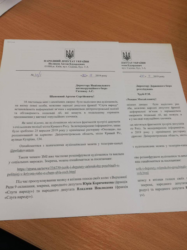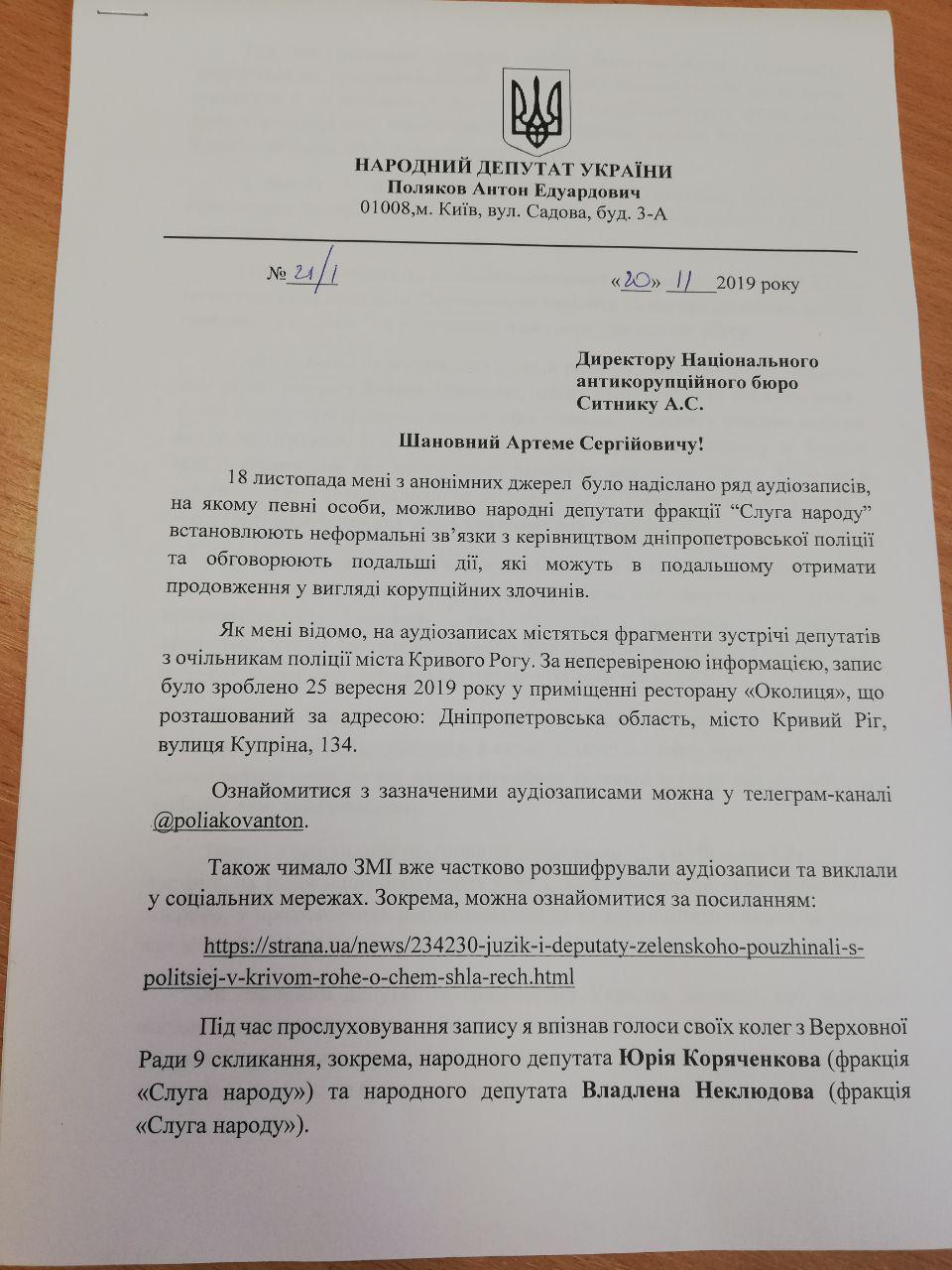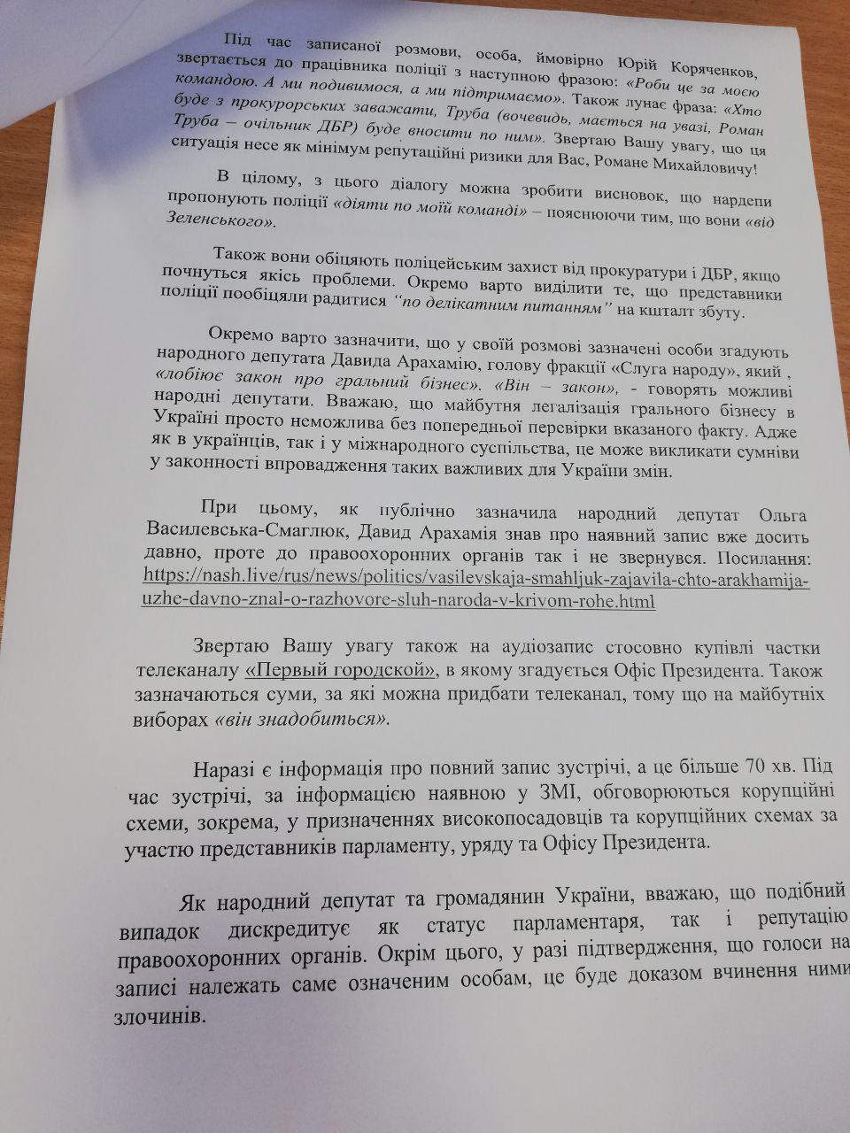 У листі йдеться про переговори представників фракції «Слуга народу» і керівництва поліції Дніпропетровської області, які відбулися в одному з ресторанів Кривого Рогу 25 вересня і отримали назву «Криворіжгейта».