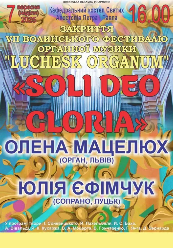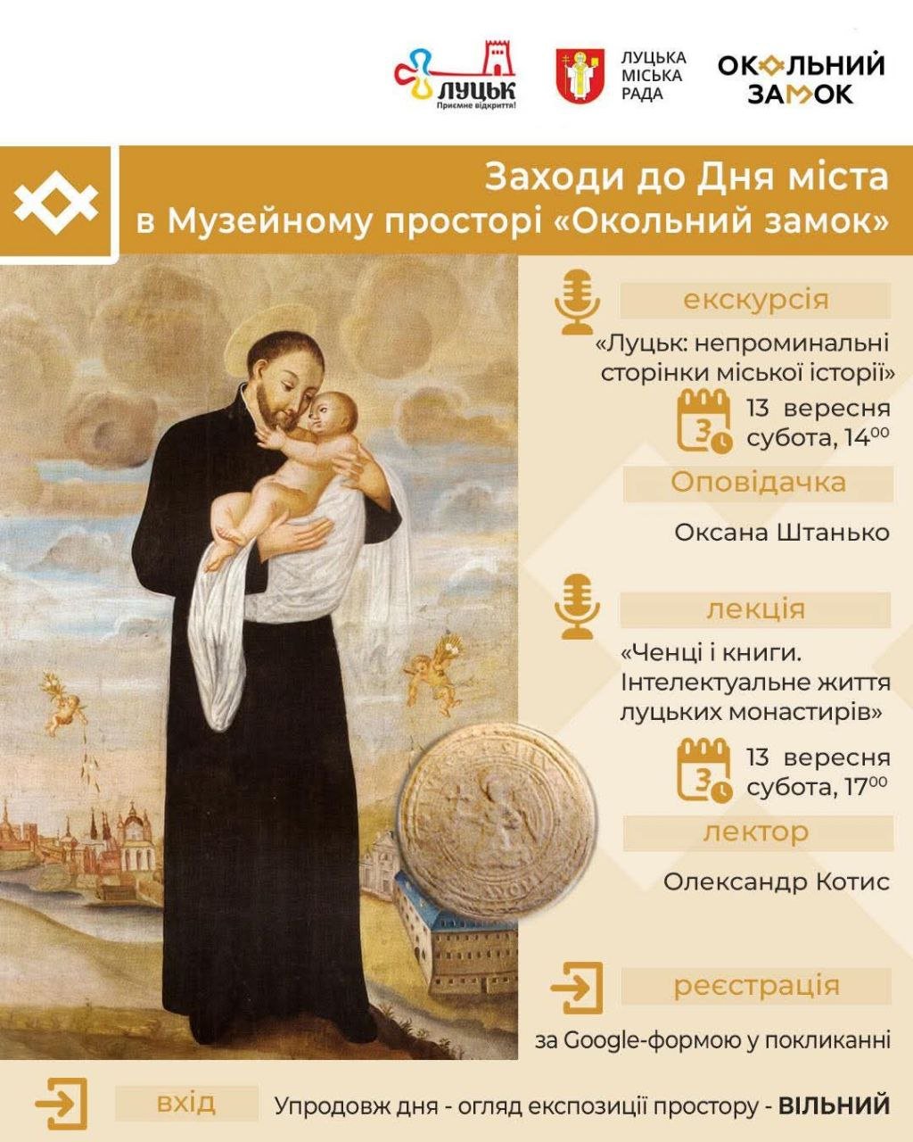 Сюрреалістична комедія «Перший раз» у драмтеатрі імені Тараса Шевченка | 4, 10 вересняПрезентація книги-альбому «Над Бугом-рікою. Традиційний народний одяг західної Волині» в «Окольному замку» | 4 вересняЗустріч з Дмитром Васильєвим, засновником і СЕО архітектурної компанії Archimatika, в Луцькому бізнес-просторі | 4 вересняВідкриття виставки Мар’яна Олексяка «Рівновага» в Музеї Корсаків | 5 вересняФранцузька комедія «Обережно – жінки!» у драмтеатрі імені Тараса Шевченка | 5 вересня«Сократівські діалоги в садибі Липинського» від PRO WOMEN UA. Реєстрація тут | 6 вересняZero Waste Fest у Луцькому бізнес-просторі | 6 вересняКонцерт музики 2000-х у РЦ «Промінь» | 6 вересняВідкритий кубок України зі середньовічного бою «Середньовічний Лучеськ» у Луцькому замку | 6-7 вересняКонцерт Soli deo gloria у костелі Святих Апостолів Петра і Павла | 7 вересняКонцерт італійської музики в дворику «Окольного замку» | 7 вересняВистава «Хованка» в мистецькому просторі «Ангар» | 7 вересняМузична комедія «Хай живе любов» у драмтеатрі імені Тараса Шевченка | 7 вересняКонцерт «Шедеври української класики» в Музеї Корсаків | 7 вересня«MHP Run4Victory Луцьк напівмарафон» біля ВНУ імені Лесі Українки | 7 вересняВоркшоп «Як представити бізнес іноземним партнерам» в центрі Дія.Бізнес | 11 вересняЕкскурсія до Дня міста в «Окольному замку» | 13 вересня