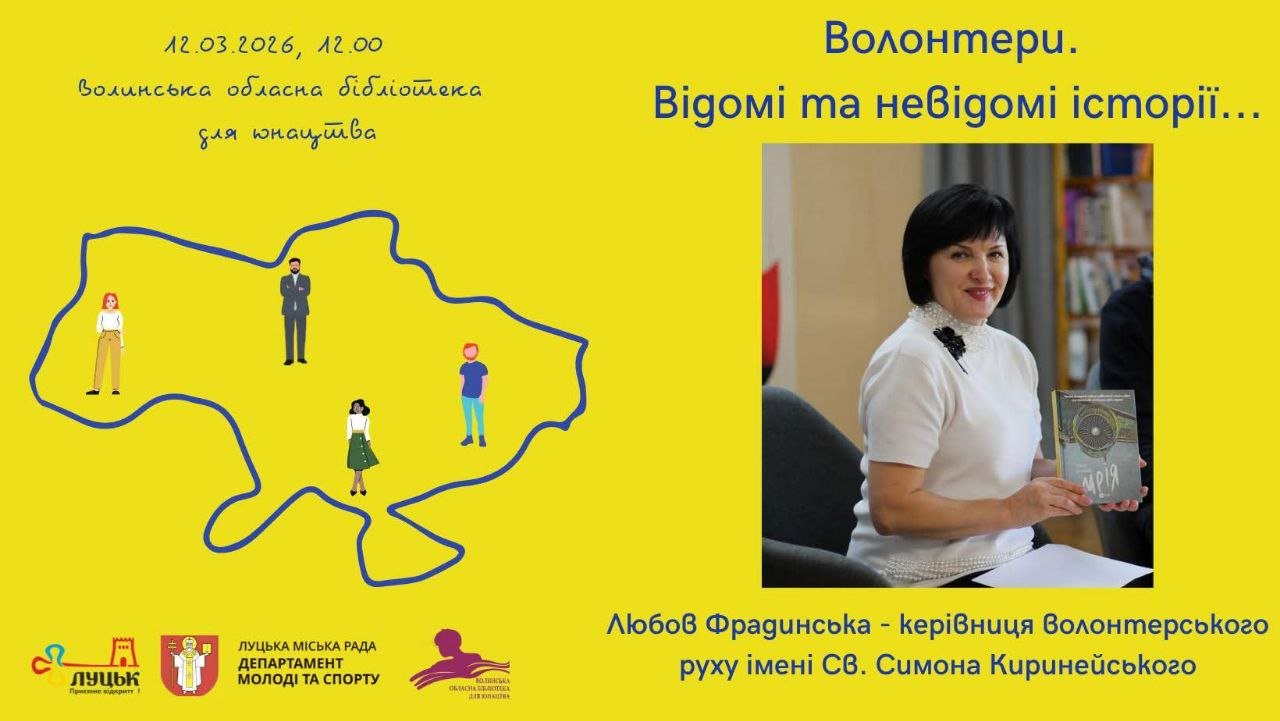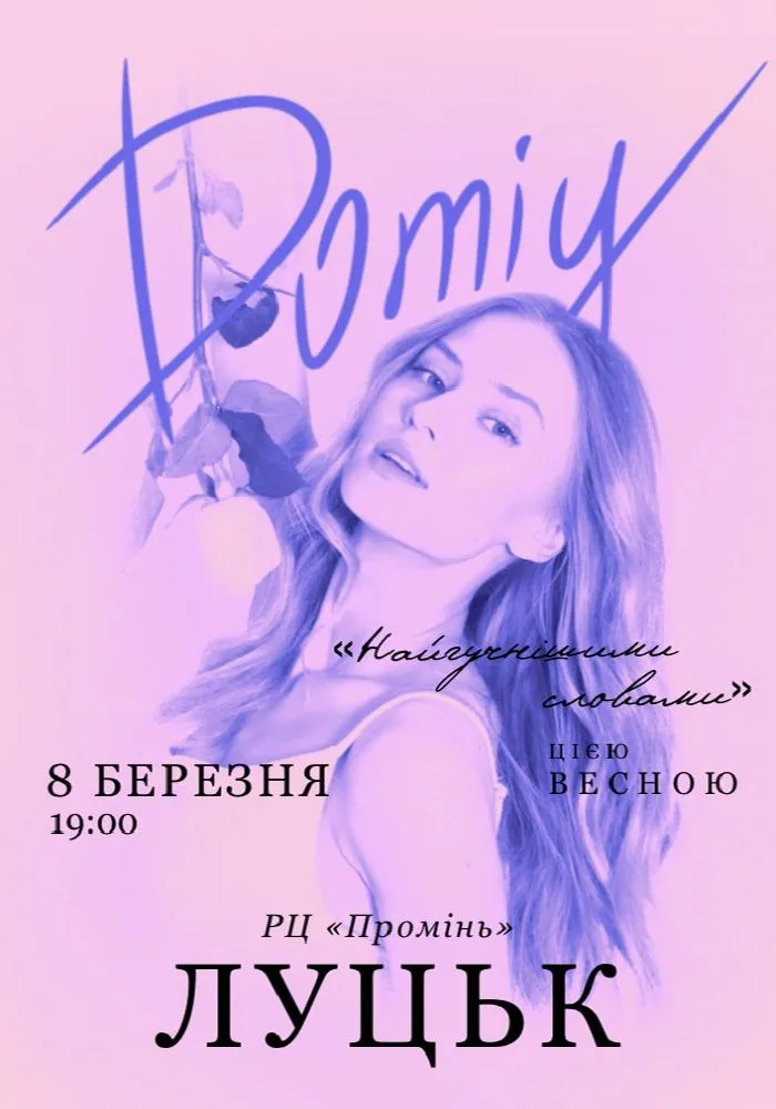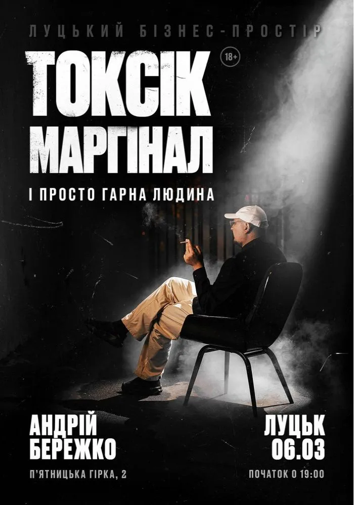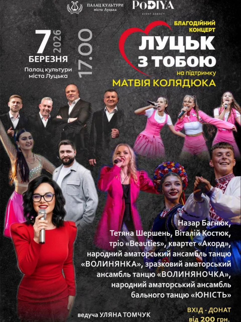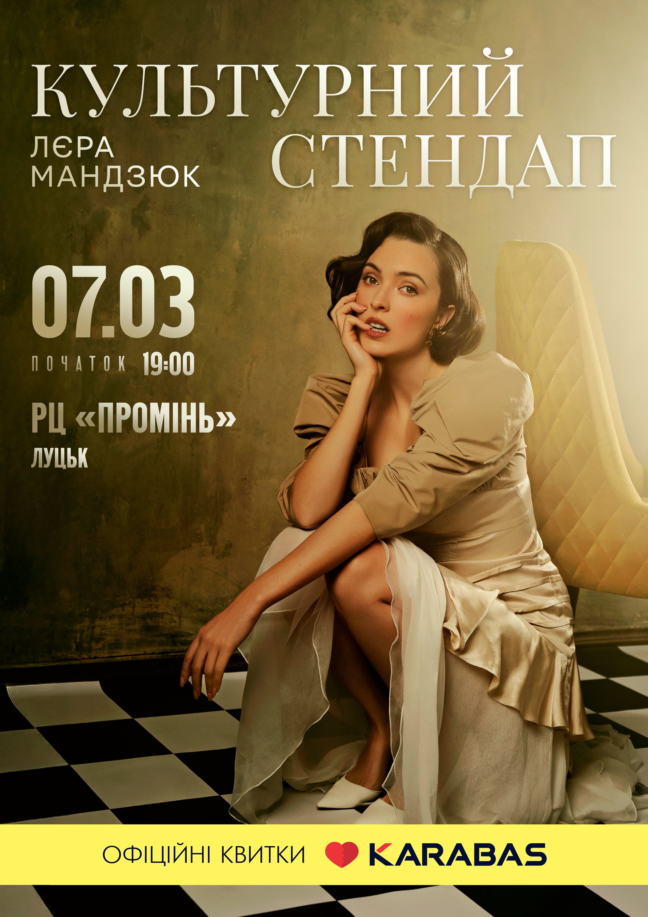 Нова вистава «Ребелія» від МУР у Волинському облмуздрамтеатрі | 5 березняМілітарі-стендап «Все буде добре, але не одразу» в театрі ляльок | 5 березняСюрреалістична комедія «Перший раз» у Волинському облмуздрамтеатрі | 5 березняБізнес-розбір «Контент-маркетинг нового часу» в центрі Дія.Бізнес | 5 березняВистава «Я бачу, вас цікавить пітьма» у Волинському облмуздрамтеатрі | 6 березняМюзикл «Мамине намисто» у РЦ «Промінь» | 6 березняКвест «Слідами луцьких кликунів». Збір на мості перед входом до Луцького замку | 6 березняСольний стендап Андрія Бережка в Луцькому бізнес-просторі | 6 березняМелодраматична комедія «Замовляю любов» у Волинському облмуздрамтеатрі | 6 березняКонцерт «Музика єднає» в музичній школі №1 | 6 березняЛєра Мандзюк із новою програмою «Культурний стендап» у РЦ «Промінь» | 7 березняТанцювальна вистава «Шафа» від Freedom Ballet у Волинському облмуздрамтеатрі | 7 березняВистава «Сонечко і снігові чоловічки» в театрі ляльок | 7 березняДрама «Не шукайте щастя, бо я його украв» у Волинському облмуздрамтеатрі | 7 березняЧемпіонат України з кіокушинкайкан карате серед юнаків і турнір «Маленький воїн», присвячений пам’яті шихана Дмитра Волинця, у спорткомплексі ВНУ | 7 березняБлагодійний концерт «Луцьк з тобою» на підтримку маленького Матвія Колядюка в Палаці культури | 7 березняДрама «Державна зрада» у Волинському облмуздрамтеатрі | 8 березняDOMIY у РЦ «Промінь» | 8 березняВистава «Веселі Роджерси та Примарний галеон» у Волинському облмуздрамтеатрі | 8 березняМоновистава «У нашім раї на землі…» у Волинському облмуздрамтеатрі | 8 березняСуперкомедія для дорослих «Мужики за викликом» у Волинському облмуздрамтеатрі | 9 березняНаталія Могилевська у Волинському облмуздрамтеатрі | 10 березняВистава «Наші Кайдаші» у Волинському облмуздрамтеатрі | 11 березняДрама-інтерв’ю «Долі жіночі, або Послання від заробітчанок» у Волинському облмуздрамтеатрі | 11 березняГурт KARNA у пабі «Карабас Барабас» | 12 березняВистава-імпровізація «Червоний борщ» у Волинському облмуздрамтеатрі | 12 березняЗустріч із волонтеркою Любов’ю Фрадинською в бібліотеці для юнацтва | 12 березня