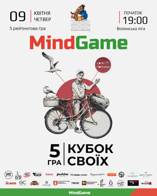Mind Game у «Карабасі Барабасі» | 9 квітняСтрасний хресний хід від Хрестовоздвиженської церкви | 10 квітняВистава «Про що мріють зірки» в театрі ляльок | 11 квітняЛекція Артема Перфілова «Співпраця світових медіа і локальних продюсерів / фіксерів: практичні кейси» в актовій залі головного корпусу ВНУ | 14 квітняВокально-скрипкове шоу «Марина і компанія»в РЦ «Промінь» | 15 квітняВистава-імпровізація «Червоний борщ» у драмтеатрі імені Тараса Шевченка | 15 квітняЛекція від наукової співробітниці Волинського краєзнавчого музею Світлани Романюк у Центрі туристичної інформації | 15 квітняЛекція «Бʼюті-бізнес в часи викликів» в центрі Дія.Бізнес | 15 квітняКомедія «Пастка для закоханих» у драмтеатрі імені Тараса Шевченка | 15 квітняВистава «Леся» у драмтеатрі імені Тараса Шевченка | 16 квітняЛекція «Подорож на «Київський острів» у Музеї Корсаків | 17 квітня