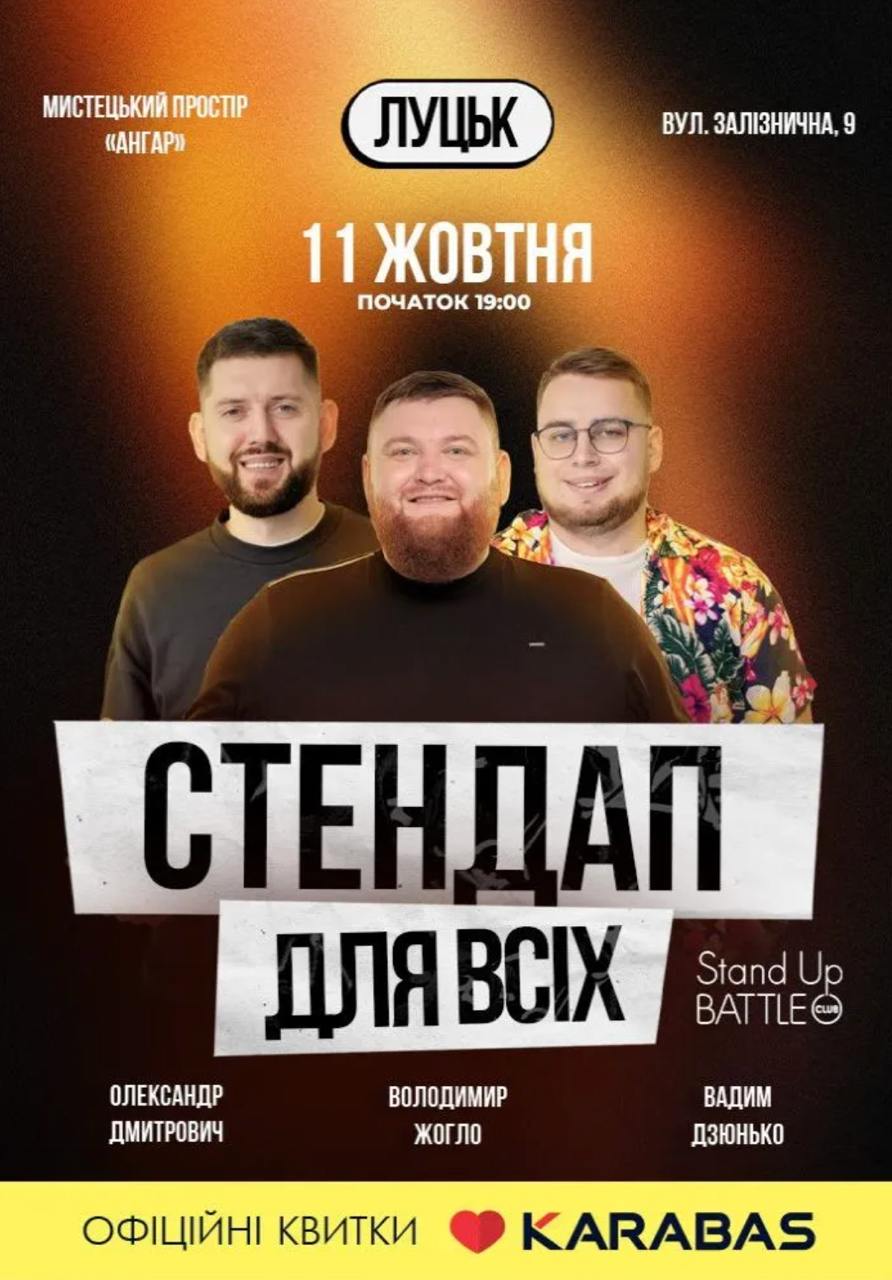 Драма інакшості «Фрекен Жюлі» в драмтеатрі імені Тараса Шевченка | 11 жовтня«Антитіла» в драмтеатрі імені Тараса Шевченка | 11 жовтняКонцерт камерної музики «Французька чарівність» у театрі ляльок | 11 жовтня«Стендап для всіх» у мистецькому просторі «Ангар» | 11 жовтняТворча майстерка з художницею Ольгою Навротюк у хабі «ВОНА» | 11 жовтняВистава «СТАРИЙ Ford Escort ТЕМНО-СИНІЙ» у театрі «Адреналін» | 11 жовтняЛекція «Ребрендинг: переосмислення ідентичності компанії» з Миколою Жичуком у центрі Дія.Бізнес | 11 жовтняТворча зустріч з Ірен Роздобудько в кафе «Променад» | 11 жовтняВистава «Зоряні колисанки» у театрі ляльок | 12 жовтняМузична комедія «Хай живе любов» у драмтеатрі імені Тараса Шевченка | 12 жовтняТренінг «Психологічна підтримка. Як допомогти собі в часи сьогодення?» Реєстрація тут | 12 жовтняПластична вистава-фантазія «Трипільські видіння» в мистецькому просторі «Ангар» | 12 жовтняLutsk Fashion Weekend & Екскурсія з істориком в Музейному просторі «Окольний замок» | 12 жовтняЛекція історика-краєзнавця Петра Троневича в Музейному просторі «Окольний замок | 12 жовтняКомічна опера для дітей «Коза-дереза» в драмтеатрі імені Тараса Шевченка | 13 жовтняВистава «Стійкий олов’яний солдатик» у театрі ляльок | 13 жовтняГірка комедія «Останній гречкосій» у драмтеатрі імені Тараса Шевченка | 13 жовтняПокази вистав від юних артистів у театрі ляльок | 13 жовтняФранцузька комедія «Бейбі БУМ» в драмтеатрі імені Тараса Шевченка | 15 жовтняКомедійний трилер з елементами мелодрами «Мільйон парашутиків» у драмтеатрі імені Тараса Шевченка | 15 жовтняЛекція «Ефективний підбір та адаптація працівників» від Тетяни Дубовик у центрі Дія.Бізнес | 16 жовтняЛекція «Як написати стратегію особистому бренду» від Лілії Кириченко у центрі Дія.Бізнес | 17 жовтня