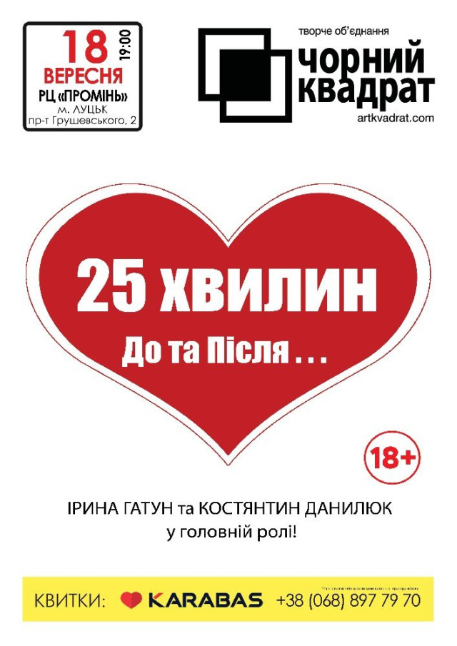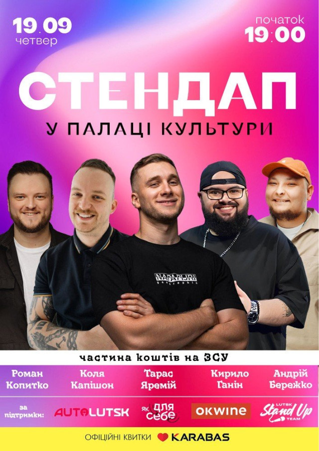 Лекція «Продажі нового часу: що змінилося у 2024 році» в центрі Дія.Бізнес | 12 вересняПрезентація виставки «Луцьк як натхнення» в Художньому музеї Луцька | 12 вересняВиставка творчих робіт студентів Волинського фахового коледжу культури і мистецтв в «Окольному замку» | 12 вересняЗахід до Дня українського кіно «Волинські митці, пошук у напрямку кіно» в бібліотеці для юнацтва | 12 вересняОля Полякова в РЦ «Промінь» | 13 вересняЛекція «Підходи формування цілей організації» в центрі Дія.Бізнес | 13 вересняЗустріч із Надією Гуменюк та Володимиром Лисом у бібліотеці-філії №6 | 14 вересняЕкскурсія Старим містом Луцька від Театрального майдану | 14 вересняТренінг від Центру готовності цивільних «Зниклі безвісти за особливих обставин. Алгоритм дій для родин зниклих безвісти» | 14 вересняЛітературний форум «про СЛОВО» в бібліотеці-філії №6 | 14 вересняАрт-імпровізація в Молодіжному центрі Волині | 14 вересняТеатралізований квест «Таємниці древнього Лучеська» від Театрального майдану | 14 вересняНауково-популярна лекція до Дня міста в Музейному просторі «Окольний замок» | 14 вересняЗаходи до 939-ї річниці Луцька | 14-15 вересняГірка комедія на дві дії «Останній гречкосій» у драмтеатрі імені Тараса Шевченка | 14, 15 вересняТурнір з волейболу серед чоловічих команд «Lutsk cup» у центральному парку | 14-15 вересняTrue Tough у MIK Studio | 15 вересняМюзикл «Рукавичка» у драмтеатрі імені Тараса Шевченка | 15 вересняКамерно-акустичний вечір IMPREZA LUBARTA у сквері біля скульптури «ЗЕРНО» | 15 вересняВистава «Веселі пригоди на лісовій галявині» в театрі ляльок | 15 вересня«Наукові пікніки» на Театральному майдані | 15 вересняЦеремонія вручення літературної премії імені Івана Корсака в музеї Корсаків | 15 вересняДрама-комедія «Академія сміху» у драмтеатрі імені Тараса Шевченка | 17 вересняКомедія «Сильні слабкі жінки» у драмтеатрі імені Тараса Шевченка | 17 вересняЛекція з урбаністики та воркшоп у сквері біля скульптури «ЗЕРНО» | 18 вересняВистава «25 хвилин до та після…» від театру «Чорний квадрат» у РЦ «Промінь» | 18 вересняЗахід «Як придбати або продати майно на Прозорро.Продажі. Інвестиційне меню від Волині» в центрі Дія.Бізнес | 18 вересняФорум «Дії творять зміни» | 19 вересняЧорна комедія «Той, що відчиняє двері» у драмтеатрі імені Тараса Шевченка | 19 вересняСтендап у Палаці культури | 19 вересняЛекція «Ефективний сайт для бізнесу» в центрі Дія.Бізнес | 19 вересняВистава «Зашнурована пара» в театрі «Адреналін» | 19 вересня