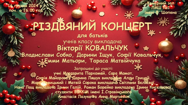 Різдвяно-новорічні заходи в Луцькій громаді | протягом грудня-січняВистава «ПЕРЕПОVIEДАКИ. ШЕВА FOREVER» в експериментальному театрі «Адреналін» | 12 грудняЗустріч «Про емоції, емоційний інтелект: методи саморегуляції, нестандартний підхід» з психологинею Наталією Водько. Реєстрація тут | 12 грудняМузичний проєкт «Неосяжний світ музики» в музичній школі №1 | 12 грудняБізнес-Екскурсія виробництвом Zigzag від Дія.Бізнес | 12 грудняФорум волонтерських ініціатив. Реєстрація тут | 13 грудняЗустріч «Дерево» у Молодіжному центрі Волині | 13 грудняВистава «Загублене свято» в театрі ляльок | 14 грудняНоворічна казка «Закоханий друг Святого Миколая і Санти» в драмтеатрі імені Тараса Шевченка | 14 грудняВистава «Як кохався дон Перлімплін з Белісою в саду» в театрі ляльок | 14 грудняКонцерт команди «30 плюс» у РЦ «Промінь» | 14 грудняСлавік Мартинюк у misto.cafe | 14 грудняЯрмарок «Різдвяний вертеп» у РЦ «Промінь» | 14 грудняВистава «Велика мрія маленької ялинки» в театрі ляльок | 15 грудняДрама інакшості «Фрекен Жюлі» в драмтеатрі імені Тараса Шевченка | 15 грудняХор імені Г. Верьовки в драмтеатрі імені Тараса Шевченка | 15 грудняТворчий майстерклас «Зимова казка» в бібліотеці-студії «ДіМ» | 15 грудняКамерний концерт гурту «12 дітей» у misto.cafe | 15 грудняРіздвяний концерт у музичній школі №1 | 16 грудняЛекція «Ментальний фактор: вплив на бізнес та життя» в центрі Дія.Бізнес | 16 грудняРозкішний вечір музики при свічках у драмтеатрі імені Тараса Шевченка | 17 грудняЗахід від Волинського молодіжного центру | 17 грудняКвіз по всесвіту Гаррі Поттера в «Карабасі Барабасі» | 18 грудняДрама-інтервʼю «Долі жіночі, або Послання від заробітчанок» в драмтеатрі імені Тараса Шевченка | 19 грудня«Піккардійська терція» в драмтеатрі імені Тараса Шевченка | 19 грудняРозмова довкола книги Анастасії Забели в ЛНТУ | 19 грудняПідсумки Urban Vision Lutsk у misto.cafe | 19 грудняВідкриття виставки «Подільська ікона ХІХ – початку ХХ століть» у Музеї волинської ікони | 19 грудняЛекція «Бізнес з людським обличчям: цінність через турботу» в центрі Дія.Бізнес | 19 грудня