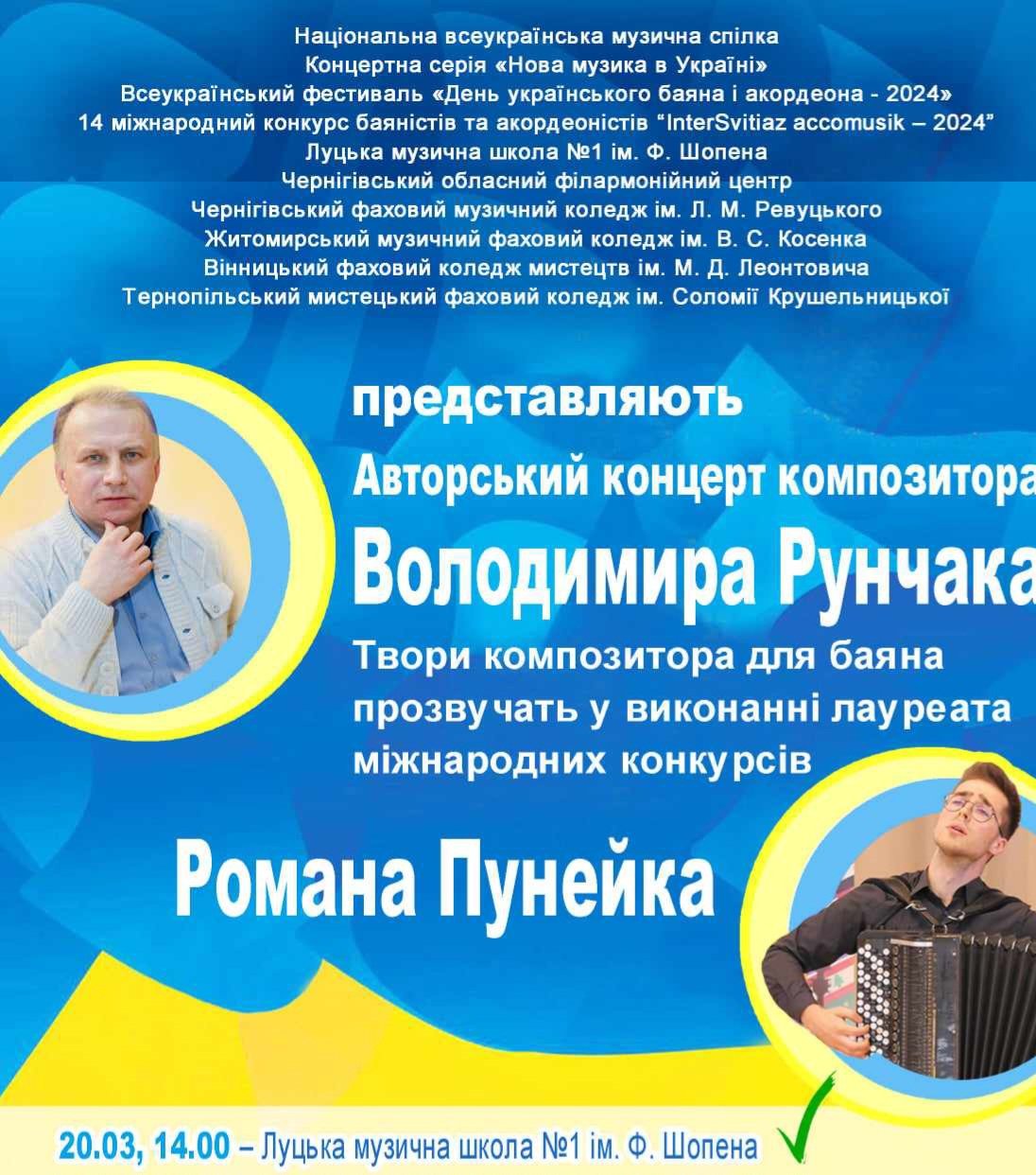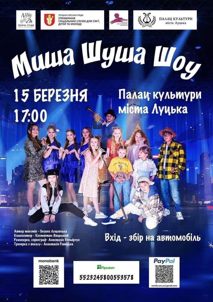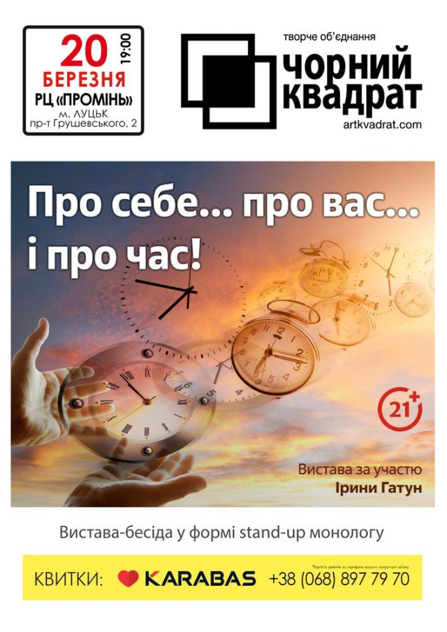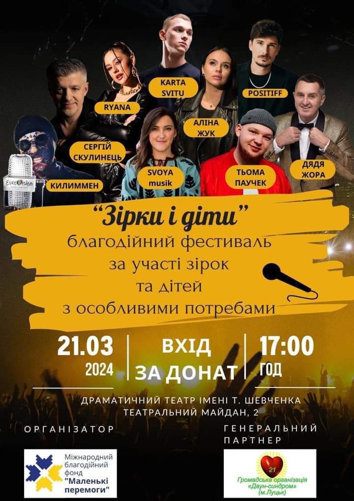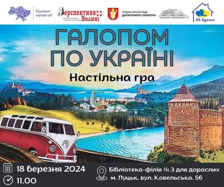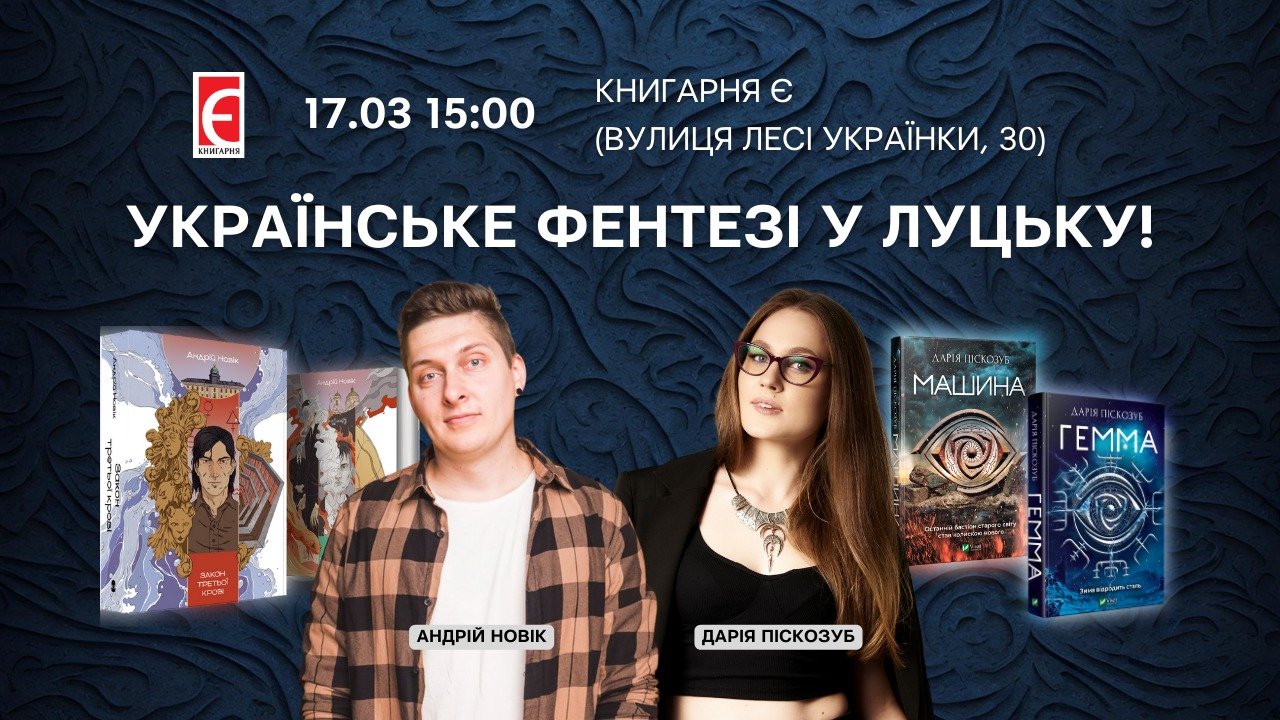 Зустріч «Як відкрити велику стоматологічну клініку під час війни» в центрі Дія.Бізнес | 14 березняБлагодійний модний івент «Fashion Day» у драмтеатрі імені Тараса Шевченка | 14 березняВистава за п’єсою Дмитра Корчинського «ВОП» у драмтеатрі імені Тараса Шевченка | 15 березняКабаре-шоу «Вільні» в комплексі Gosti grill&forest | 16 березняДрама «Не шукайте щастя, бо я його украв» у драмтеатрі імені Тараса Шевченка | 15 березняЗустріч із Надією Гуменюк і Володимиром Лисом у Музейному просторі «Окольний замок» | 15 березняПрезентація проєкту Оксани Борисової «ДНК — код свободи. Ідентифікація війною» в музеї Корсаків | 15 березня«Миша Шуша Шоу» у Палаці культури | 15 березняЛекція «TikTok для бізнесу» в центрі Дія.Бізнес | 15 березняСтендап у Палаці культури | 16 березняВистава «Мандрівний лялькар» у театрі ляльок | 16 березняКомічна опера «Наталка Полтавка» у драмтеатрі імені Тараса Шевченка | 16 березняХристина Соловій у Палаці культури | 17 березняКомедія «Шахрайки» у драмтеатрі імені Тараса Шевченка | 17 березня«Казка про рудого чорта та козацький рід» у театрі ляльок | 17 березняЗустріч з авторами Андрієм Новіком і Дарією Піскозуб у книгарні «Є» | 17 березняЕкскурсії з істориком від PRO WOMEN UA | 17 березняКінопоказ «Шлях поколінь» у бібліотеці для юнацтва | 17 березняМюзикл для дітей «Попелюшка» у драмтеатрі імені Тараса Шевченка | 17 березняНастільна гра «Галопом по Україні» в бібліотеці № 3 | 18 березняМелодраматична комедія «Замовляю любов» у драмтеатрі імені Тараса Шевченка | 19 березняMIND GAME 2023-2024 | 19 березняЛекція «Постановка голосу для публічних виступів» у центрі Дія.Бізнес | 19 березняВистава «Гатун про себе… про вас… і про час!» від театру «Чорний квадрат» у РЦ «Промінь» | 20 березняДрама-комедія «Академія сміху» у драмтеатрі імені Тараса Шевченка | 20 березняВідкриття урбан-клубу в Молодіжному центрі Волині | 20 березняЗустріч із Оксаною Словік «Як встигнути за стрімкими змінами й не втратити себе?» від PRO WOMEN UA | 20 березняАвторський концерт Володимира Рунчака в музичній школі № 1 | 20 березняКонцерт гурту «Без обмежень» у комплексі Gosti grill&forest | 21 березняКонцерт «І душа зігріється у звуках» у театрі ляльок | 21 березняБлагодійний фестиваль у драмтеатрі імені Тараса Шевченка | 21 березняДрама інакшості «Фрекен Жюлі» у драмтеатрі імені Тараса Шевченка | 21 березняКінопоказ документального фільму «Щедрик» у Волинському обласному молодіжному центрі | 21 березня