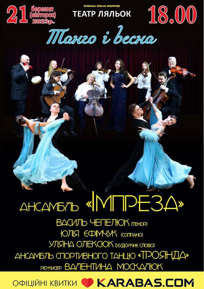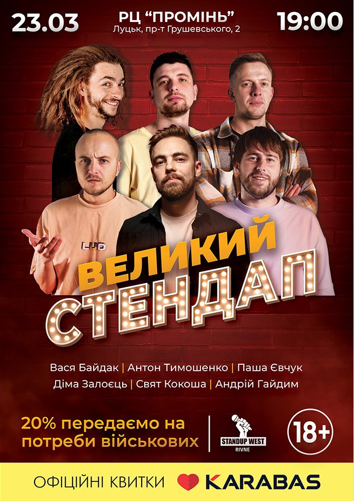 Ансамбль «Імпреза» у Волинському театрі ляльок | 21 березняGrandma’s Smuzzi у Палаці культури міста Луцька | 21 березняПрезентація графічної новели «На межі» та виставки портретів «Втрачений дім» у Волинському академічному театрі імені Тараса Шевченка | 23 березня«Великий стендап» у РЦ «Промінь» | 23 березня