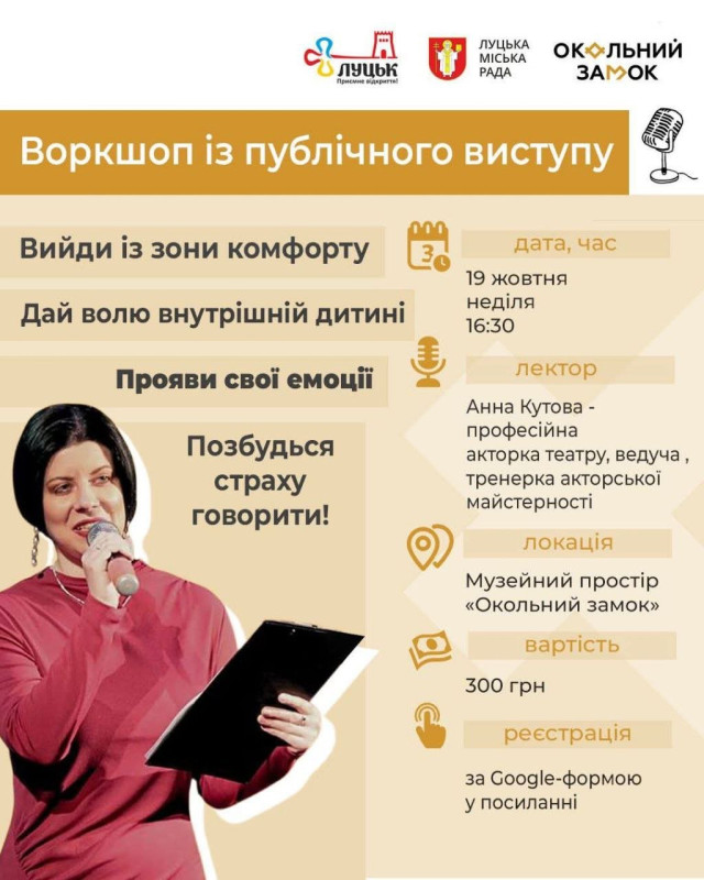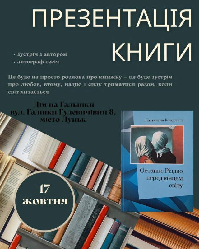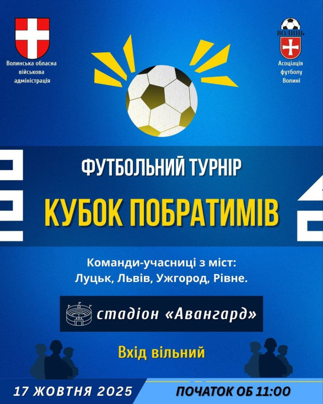Концерт команди «30+» у РЦ «Промінь» | 16 жовтняПрезентація посібника «Доступність на практиці» у ВОУНБ імені Олени Пчілки | 16 жовтня«Дизель-шоу» у РЦ «Промінь» | 17 жовтняПрезентація книжки «Останнє Різдво перед кінцем світу» в Домі на Гальшки | 17 жовтняФутбольний турнір ветеранів на стадіоні «Авангард» | 17 жовтняЦирк біля ТРК «Порт Сіті» | 17 жовтняВистава «Про що мріють зірки» в театрі ляльок | 18 жовтняГірка комедія «Останній гречкосій» у драмтеатрі імені Тараса Шевченка | 18 жовтня«Roblox, Minecraft, BrawlStars в інтернеті» в Палаці культури | 18 жовтняФутзальний турнір у ВОДЮСШ | 18-19 жовтняМюзикл «Попелюшка» у драмтеатрі імені Тараса Шевченка | 19 жовтняВистава «Обережно, незнайомець» у театрі ляльок | 19 жовтняСвято гарбуза в Луцькому зоопарку | 19 жовтняКомедія «Корвалол для Вероніки» у драмтеатрі імені Тараса Шевченка | 19 жовтняВоркшоп із публічного виступу в Музейному просторі «Окольний замок» | 19 жовтняТворча зустріч на факультеті культури і мистецтв ВНУ імені Лесі Українки | 20 жовтняХор «Гомін» у драмтеатрі імені Тараса Шевченка | 20 жовтня«Мистецька платформа» в музичній школі №1 | 21 жовтняОфлайн-тренінг «Нейропсихологічна десенсибілізація в роботі з травмою війни» в Луцьку. Реєстрація тут | 20-24 жовтняДрама «Солодка Даруся» у драмтеатрі імені Тараса Шевченка | 22 жовтняЛекція «Роль мрій у створенні сильних команд та ефективних проєктів» у центрі Дія.Бізнес | 23 жовтня