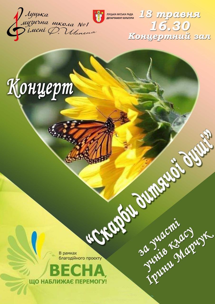 Концерт «Скарби дитячої душі» в Луцькій музичній школі №1 імені Фридерика Шопена| 18 травняВистава «Театру драматургів» із Києва «ВІЙСЬКОВИЙ КОНЦЕРТ» у просторі «Культурне укриття» | 18 травняКомедія на дві дії «Сватання на Гончарівці» у Волинському академічному театрі Тараса Шевченка | 18 травняHealth mentor спільно з медичним центром«Благомед» у «ВОНА хаб. Луцьк» | 19 травняДрама-інтерв’ю «Долі жіночі, або Послання від заробітчанок» у Волинському академічному театрі Тараса Шевченка | 19 травняПерегляд мотиваційних фільмів у «ВОНА хаб. Луцьк» | 19 травняWetelo Conference-2023: Web3, «нейронка» і рекрутерський камінг-аут у просторі «Культурне укриття» | 20 травняКонцерт «4 РОКИ LNJ» у РЦ «Промінь» | 20 травняВистава «Ріпка, або Казка на городі» у Волинському театрі ляльок | 20 травняВсеукраїнська акція «Велодень-2023» від ТРЦ «Порт Сіті» | 21 травняКазка на дві дії «Котигорошко» у Волинському академічному театрі Тараса Шевченка | 21 травняКонцерт «Європейська мелодія миру» у Волинському академічному театрі Тараса Шевченка | 21 травняВистава «Кіт у чоботях» у Волинському театрі ляльок | 21 травняОлег Скрипка. Batko nash Bandera у Волинському академічному театрі Тараса Шевченка | 23 травняСерйозна комедія «Як виростити чоловіка в домашніх умовах» у Волинському академічному театрі Тараса Шевченка | 24 травня