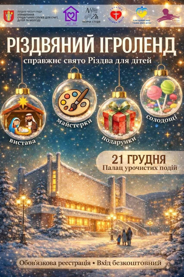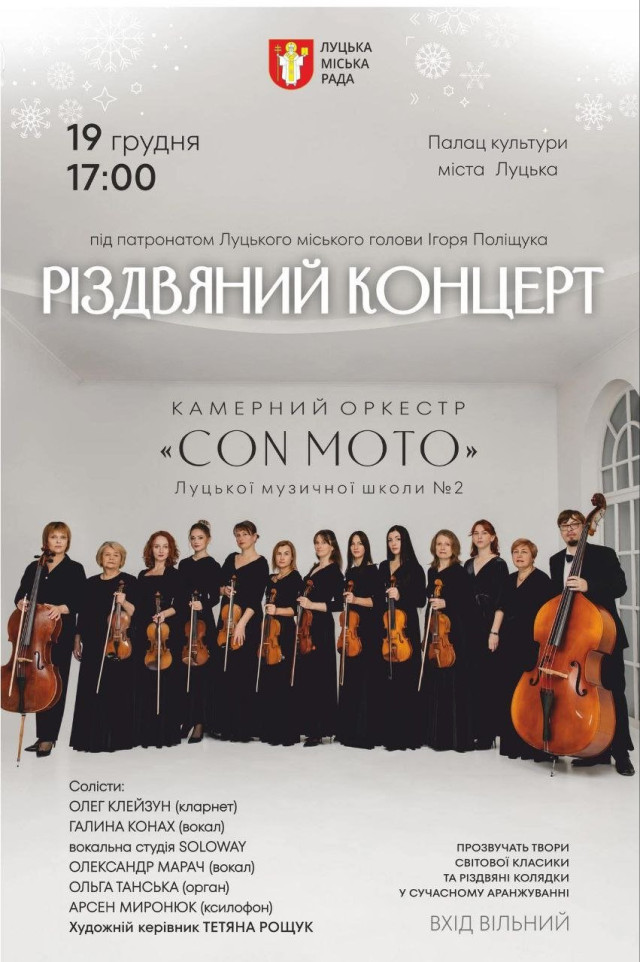 Прем’єра вистави «Ідеальний раб» за п’єсою «Емігранти» у драмтеатрі імені Тараса Шевченка | 18 грудняПрезентація книжки «Справа Гончарука». Останній розстріляний повстанець» у Волинському краєзнавчому музеї | 18 грудняПерегляд анімаційного фільму «Різдвяна історія» в Музейному просторі «Окольний замок» | 18 грудняХор «Гомін» із новою різдвяною програмою «Той самий «Щедрик» у драмтеатрі імені Тараса Шевченка | 19 грудняРіздвяний концерт у Палаці культури | 19 грудняЛекція «Волинська Коляда» в Музейному просторі «Окольний замок» | 19 грудняУРБАН-ВЕРТЕП «ДЕ ТЕПЛО» за поезією Сергія Жадана в залі Волинського фахового коледжу культури і мистецтв імені Ігоря Стравінського | 19 грудняРіздвяний ярмарок ветеранського бізнесу «Я зміг – і ти зможеш!» у Луцькому бізнес-простірі | 20 грудняВистава «Попелюшка» в театрі ляльок | 20 грудняМузичне шоу для дітей «Щенячий патруль. Рятівники Нового року» в Палаці культури | 20 грудня«Різдвяний ігроленд» у Палаці урочистих подій | 21 грудняНеймовірне циркове шоу «Alice» у драмтеатрі імені Тараса Шевченка | 21 грудняВистава «Таємниця зачарованого лісу» в театрі ляльок | 21 грудняКонцерт «Симфонія зимових мелодій» у драмтеатрі імені Тараса Шевченка | 21 грудняГра-читка «Скрудж. Найкраще Різдво» в мистецькому просторі «Ангар» | 21 грудняКонцерт «Різдвяний джаз при свічках» у драмтеатрі імені Тараса Шевченка | 22 грудняПередноворічні посиденьки в пивному клубі «Оболонь» | 22-23, 25-29 грудняВолинський народний хор у драмтеатрі імені Тараса Шевченка | 25 грудня