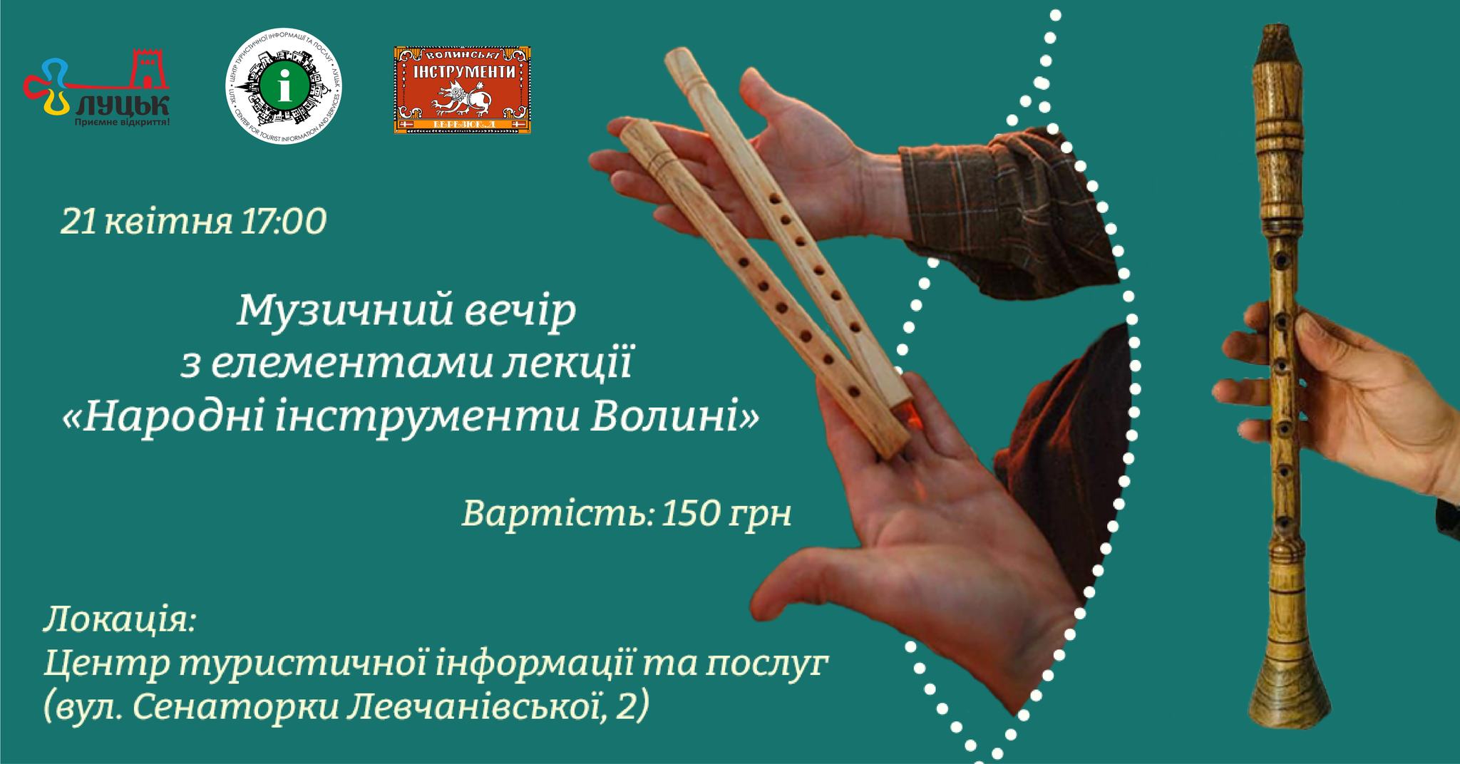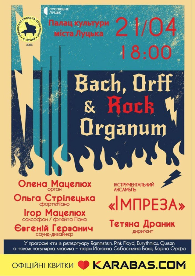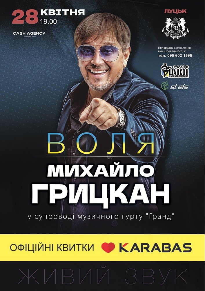 Настя Каменських у рамках благодійного туру «Я – Україна» в РЦ «Промінь» | 21 квітняМузичний вечір з елементами лекції «Народні інструменти Волині» в Центрі туристичної інформації та послуг | 21 квітняКонцерт «Bach, Orff & Rock Organum» у Палаці культури Луцька | 21 квітняВистава «Фрекен Жюлі» у Волинському академічному театрі імені Тараса Шевченка | 21 квітняВистава «Рижий ведмедик» у Волинському академічному театрі ляльок | 22 квітняКомічна опера на дві дії «Наталка Полтавка» у Волинському академічному театрі імені Тараса Шевченка | 22 квітняГурт «СКАЙ» у рамках туру на підтримку альбому «Напролом» у РЦ «Промінь» | 23 квітняКонкурс дитячої творчості «Кольорові писанки» в культурно-мистецькому центрі «Красне» | 23 квітняВистава «Пригоди Піноккіо» у Волинському академічному театрі ляльок | 23 квітняВолинський трейл по чарівному лісі «Біг. Ти. Квіти» від паркування на «Альпініст Лучеськ трейл» | 23 квітняВистава «Не шукайте щастя, бо я його украв» у Волинському академічному театрі імені Тараса Шевченка | 26 квітняЛегенда-містерія на дві дії «Енеїда» у Волинському академічному театрі імені Тараса Шевченка | 27 квітняМихайло Грицкан у супроводі музичного гурту «Гранд» у Show Basilic | 28 квітня