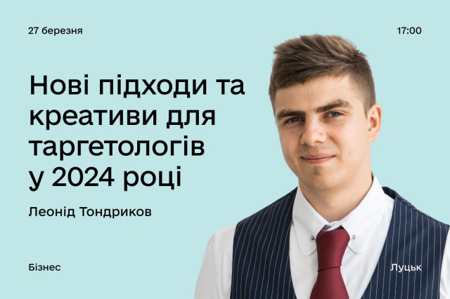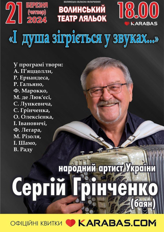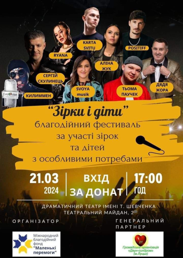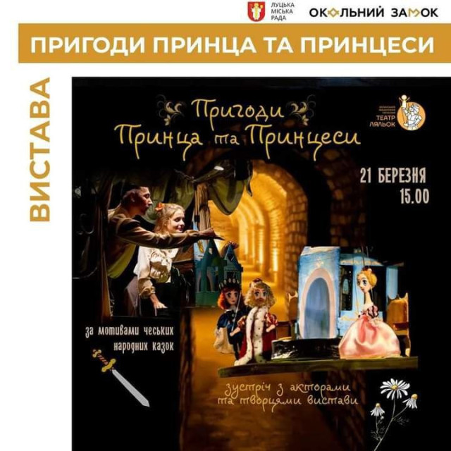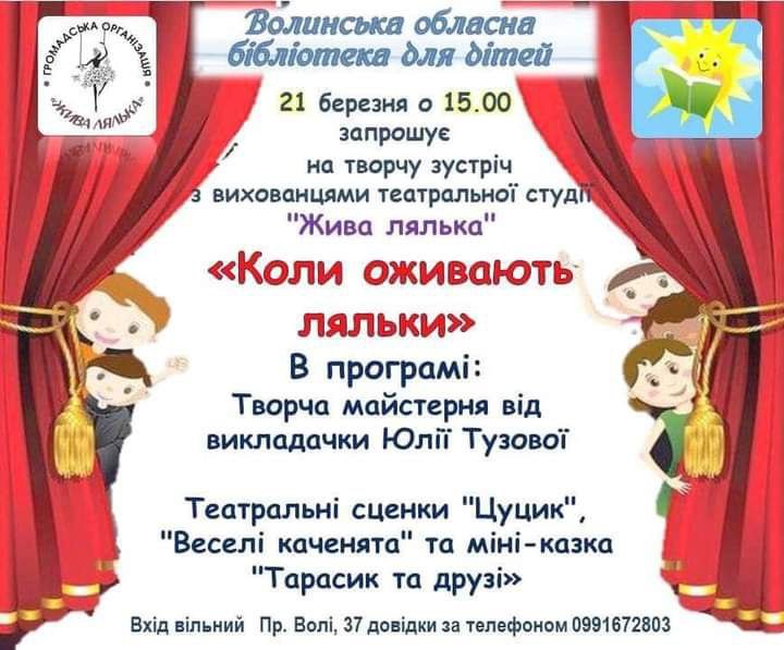Концерт гурту «Без обмежень» у комплексі Gosti grill&forest | 21 березняКонцерт «І душа гріється у звуках» у театрі ляльок | 21 березняБлагодійний фестиваль «Зірки і діти» у драмтеатрі імені Тараса Шевченка | 21 березняМайстер-клас «Виготовлення оберегу для солдат своїми руками» у Волинському краєзнавчому музеї | 21 березняДрама інакшості «Фрекен Жюлі» у драмтеатрі імені Тараса Шевченка | 21 березняКінопоказ документального фільму «Щедрик» у Волинському обласному молодіжному центрі | 21 березняВистава «Пригоди принца і принцеси» в Музейному просторі «Окольний замок» | 21 березняЗустріч «Коли оживають ляльки» в обласній бібліотеці для дітей | 21 березняТренінг «Як розпочати власну справу» в кар’єрному хабі «ВОНА» | 21 березняВистава «Тарас» у театрі ляльок | 22 березняЗустріч із Максом і Тетяною Кідруками у просторі «Мистецький» ВОУНБ імені Олени Пчілки | 22 березняМістична вистава «Вій» у драмтеатрі імені Тараса Шевченка | 22 березняТренінг «Система пошуку талантів. Сучасний рекрутинг» у РМВА Бізнес-Академія | 22 березняЛекція «Соціально-орієнтована архітектура» від Аліни Саніної в центрі Дія.Бізнес | 22 березняДрама «Безталанна» у драмтеатрі імені Тараса Шевченка | 23 березняБлагодійний мистецький вечір «Музика народжена війною» в Палаці культури | 23 березняВистава «Снігова королева» в театрі ляльок | 23 березняПрезентація книги Андрія Зелінського «Семенові зорі» в Музейному просторі «Окольний замок» | 23 березняКазка «Котигорошко» у драмтеатрі імені Тараса Шевченка | 24 березня«Пан Коцький» у театрі ляльок | 24 березняОновлена гастрономічна екскурсія від Театрального майдану | 24 березняКомедія «Сватання на Гончарівці» у драмтеатрі імені Тараса Шевченка | 24 березняКонцерт «Мелодії прийдешньої весни» у центрі культури «Княгининок» | 24 березняАвтопробіг на підтримку гарнізону «Маріуполь» від Театрального майдану | 24 березняМайстер-клас з виготовлення волинської витинанки «Голуб Миру» у Волинському краєзнавчому музеї | 25 березняВечір поезії з Тетяною Власовою у книгарні-кавʼярні «Books.and.Brew» | 25 березня«Танго на пуантах» у драмтеатрі імені Тараса Шевченка | 26 березняQUIZ літературний у «Карабасі Барабасі» | 27 березняЛекція «Про що не знають таргетологи у 2024 році» в центрі Дія.Бізнес | 27 березняІнтригуюча комедія «Женихи» у драмтеатрі імені Тараса Шевченка | 28 березняСвятослав Вакарчук із благодійним концертом у РЦ «Промінь» | 28 березня