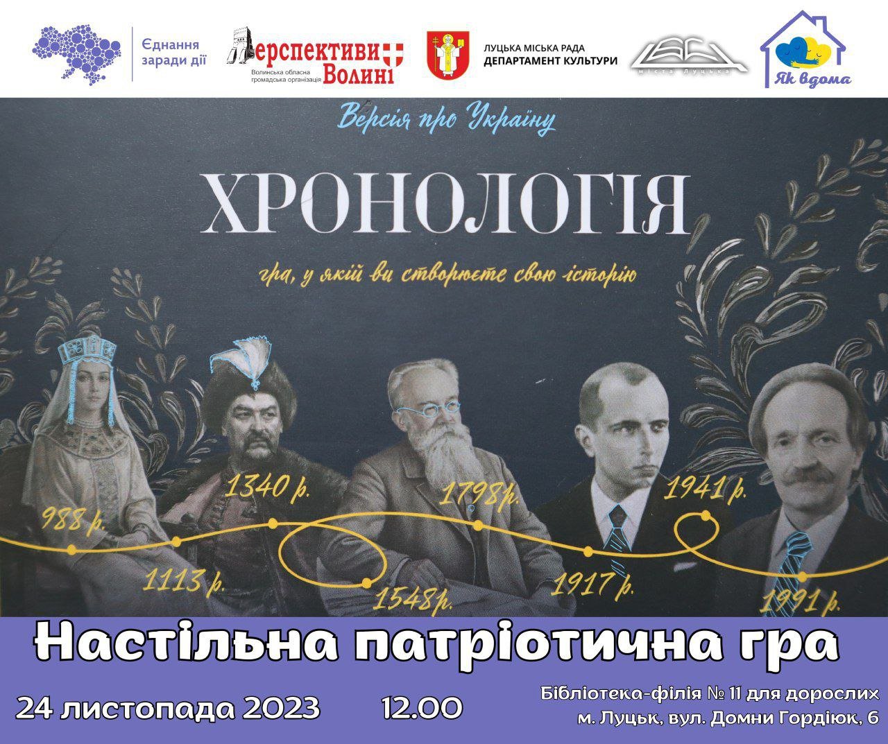 Майнд Гейм у бункері-броварні «Карабас-Барабас» | 23 листопадаВідкриття проєкту Олега Давиденка «Рукописи» в Музеї Корсаків | 24 листопадаНастільна патріотична гра «Хронологія» у Бібліотеці-філії № 11 для дорослих | 24 листопадаКонцерт у камерному залі Луцької музичної школи № 1 імені Фридерика Шопена | 24 листопадаВечір поезії у Культурному укритті | 24 листопадаМелодраматична комедія «Замовляю любов» в облмуздрамтеатрі | 24 листопадаВистава «За дверима» форум-театру #про_ТИ_дія у ВОНА хаб. Луцьк | 25 листопада«Зачарована принцеса» в театрі ляльок | 25 листопадаКонцерт-аукціон «Плюс Плюс» за участю відомих зіркових артистів у заміському комплексі Gosti | 25 листопада«Лісова пісня» в театрі ляльок | 25 листопадаДрама «Століття Якова: перше кохання» в облмуздрамтеатрі | 25 листопадаЧемпіонат Волині із грепплінгу та Чемпіонат Луцька із панкратіону у Спортивному комплексі Університету імені Лесі Українки | 25-26 листопадаГурт «Чумацький Шлях» у пивному клубі «Оболонь» | 26 листопадаКомедія «Шахрайки» в облмуздрамтеатрі | 26 листопадаЗустріч з ветераном Річардом Девісом та його дружиною Тіною із Теннессі у Ветеранському просторі Плюс Плюс | 26 листопадаМюзикл «Рукавичка» в облмуздрамтеатрі | 26 листопадаМайстер клас зі скандинавської ходьби від професійних спортсменів Karpatiya Nordic Walking у ТРЦ ПортCitу | 26 листопада«Кіт у чоботях» у театрі ляльок | 26 листопадаЗабіг «Acting for survivors» до міжнародної акції «16 днів активізму проти насильства» на стадіоні гімназії № 20 | 26 листопадаШоу «Твоя тінь» в облмуздрамтеатрі | 27 листопадаСуперкомедія «Новорічна афера по-українськи» в облмуздрамтеатрі | 28 листопадаВистава «На полі крові» в облмуздрамтеатрі | 28 листопадаЛекція «Як продавати український продукт на Etsy» в центрі Дія.Бізнес у Луцьку | 28 листопадаВистава «Мої емоції – це ти!» від театру «Чорний квадрат» у РЦ «Промінь» | 29 листопадаДрама-комедія «Академія сміху» в облмуздрамтеатрі | 29 листопадаQuiz у бункері-броварні «Карабас-Барабас» | 29 листопада