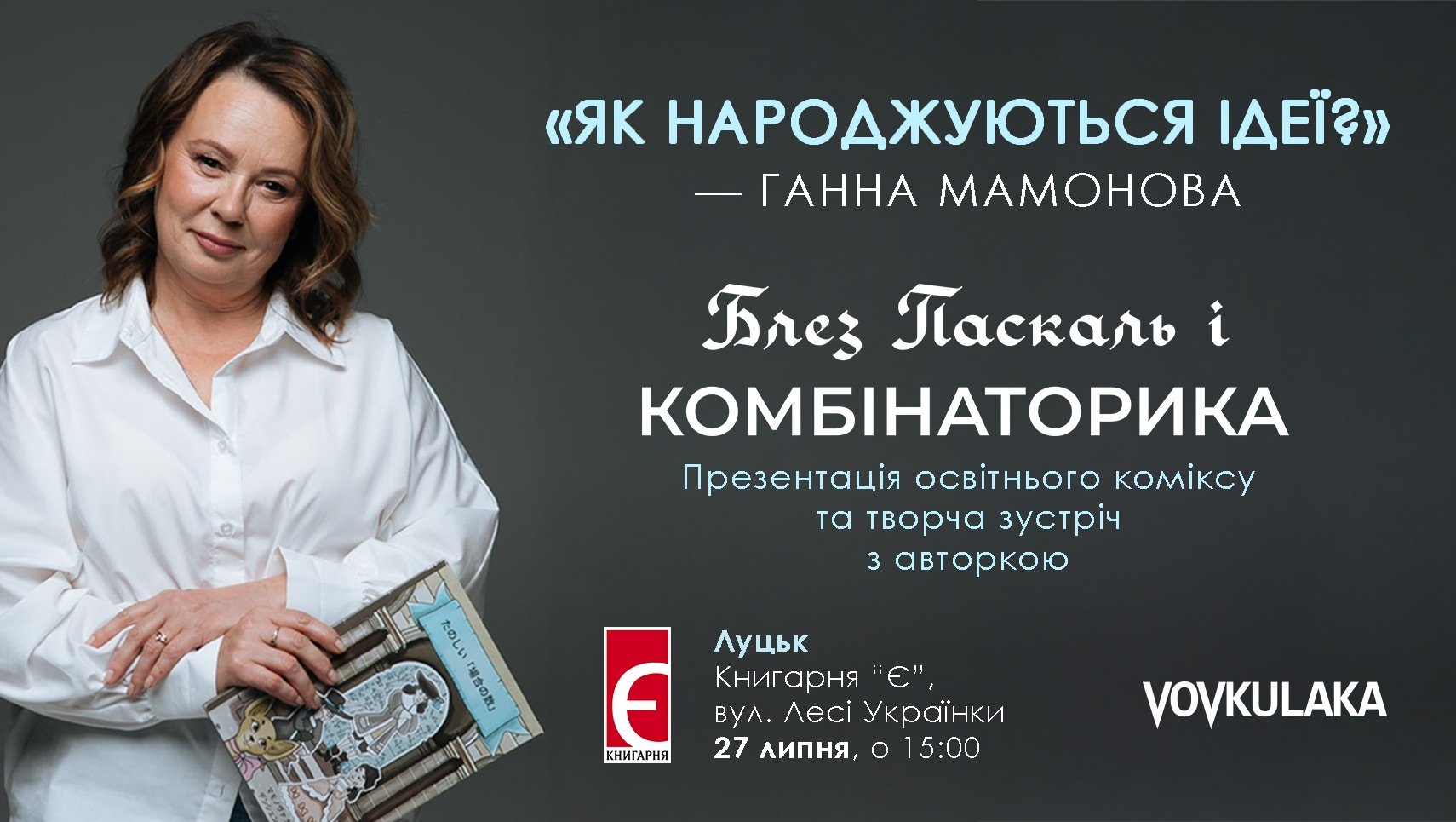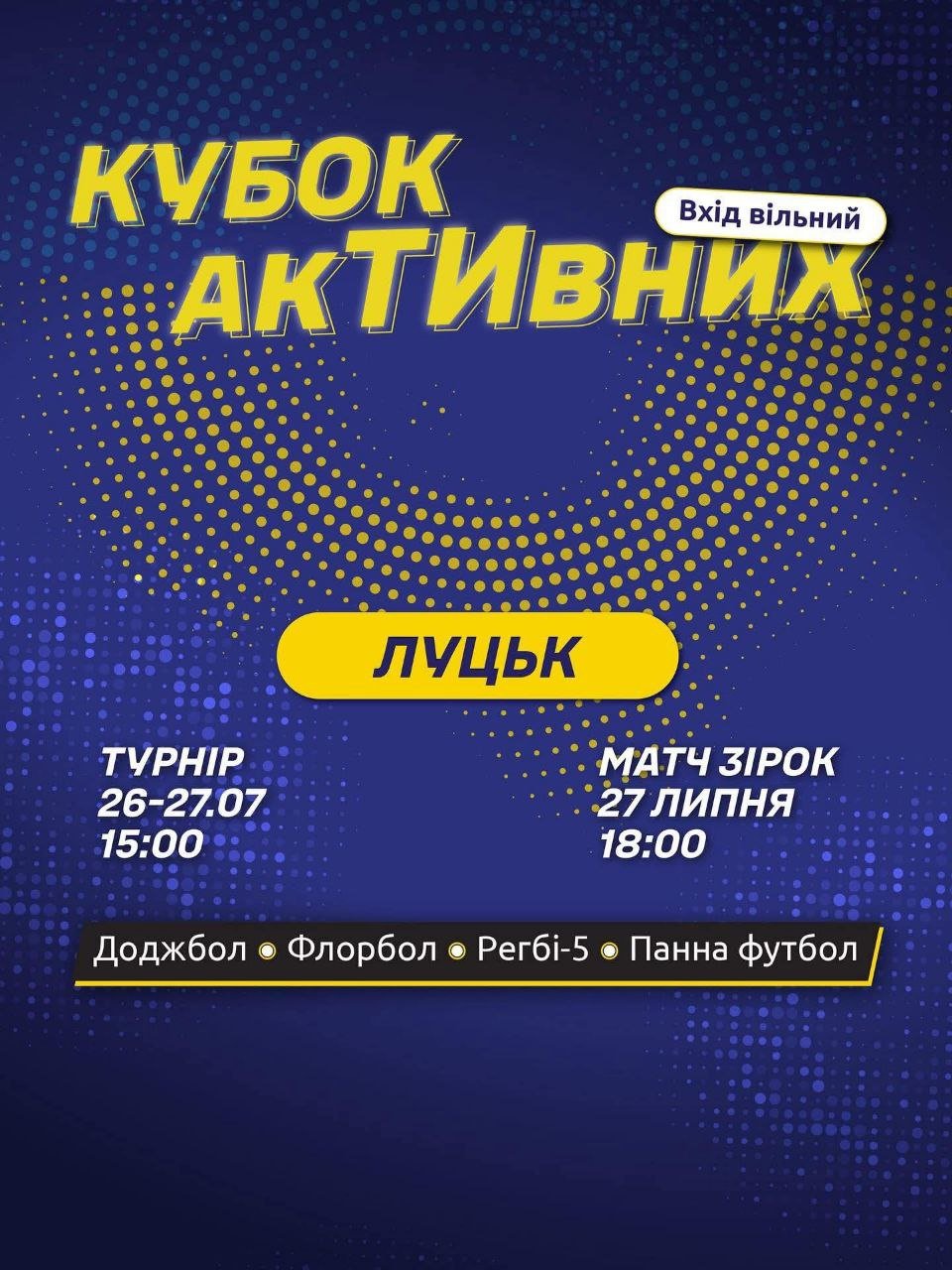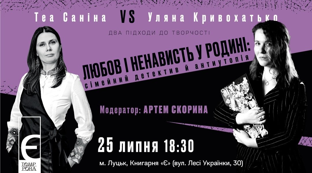 Теа Саніна та Уляна Кривохатько. «Любов і ненависть у родині: сімейний детектив й антиутопія». Книгарня «Є» | 25 липняРозмова «Як побудувати персональний бренд – свій, живий, правдивий?» в misto.cafe | 25 липняЯрмарок ветеранського бізнесу «Я зміг – і ти зможеш!» на березі озера Світязь | 25 липняЛюбArt Concert на іподромі в центральному парку | 26-27 липня«Кубок АкТИвних» у центральному парку | 26-27 липняADAM у заміському комплексі GOSTI | 26-27 липняПрогулянка-екскурсія «Перетини: стиль Луцька крізь часи». Реєстрація тут | 27 липняПластична вистава-фантазія «Трипільські видіння» в центрі «Або Або», що поруч зі скульптурою «Зерно» | 27 липняПрезентація освітнього коміксу «Блез Паскаль і Комбінаторика» в книгарні «Є» | 27 липняВідкриття проєкту «Місце існування» художника Дмитра Єрліха і звукорежисера, саунд-артиста Іллі Петрова в Музеї сучасного українського мистецтва Корсаків | 1 серпня«Парк ліхтарів» на території центрального парку імені Лесі Українки | до 10 серпня