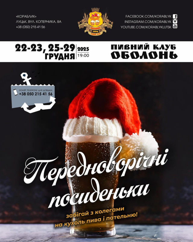 Волинський народний хор у драмтеатрі імені Тараса Шевченка | 25, 26 грудняПередноворічні посиденьки в пивному клубі «Оболонь» | 25-29 грудняСюрреалістична комедія «Перший раз» у драмтеатрі імені Тараса Шевченка | 26 грудняВистава «Конотопська відьма» в драмтеатрі імені Тараса Шевченка | 27 грудняФранцузька комедія «Обережно – жінки!» у драмтеатрі імені Тараса Шевченка | 27 грудняВистава «Лускунчик» у театрі ляльок | 27 грудняКонцерт «Теплий вертеп. Пісні зими» у драмтеатрі імені Тараса Шевченка | 28 грудняВистава «Велика мрія маленької ялинки» в театрі ляльок | 28 грудняУчасницький перформанс «Чия ти, чашко?» у просторі «Ангар» | 28 грудняКонкурс колядок та щедрівок «Зійшла зоря чудна» в Центрі культури села Княгининок | 28 грудня«Зимовий євроквест». Початок від Центру туристичної інформації | 28 грудняМузична комедія «Різдвяна ніч» у драмтеатрі імені Тараса Шевченка | 30 грудня