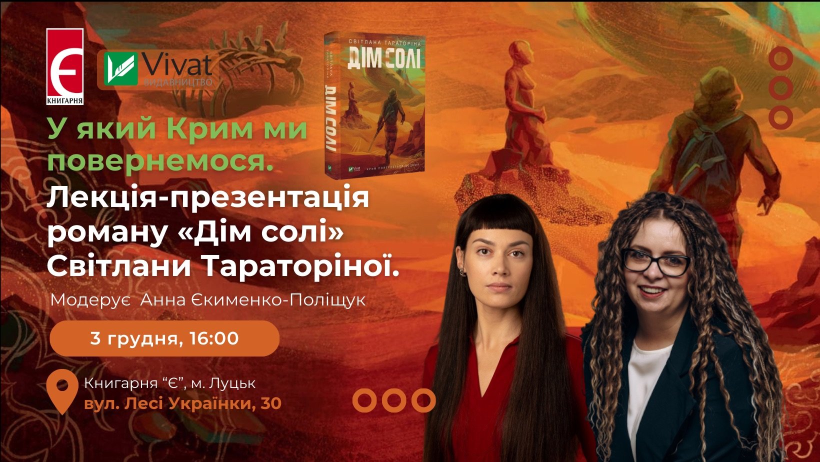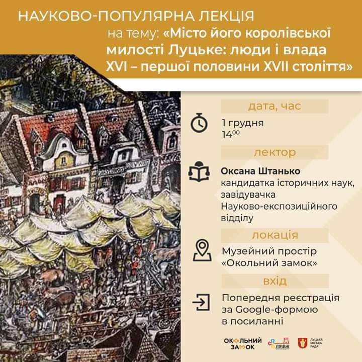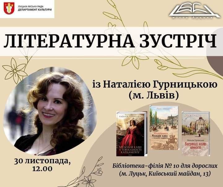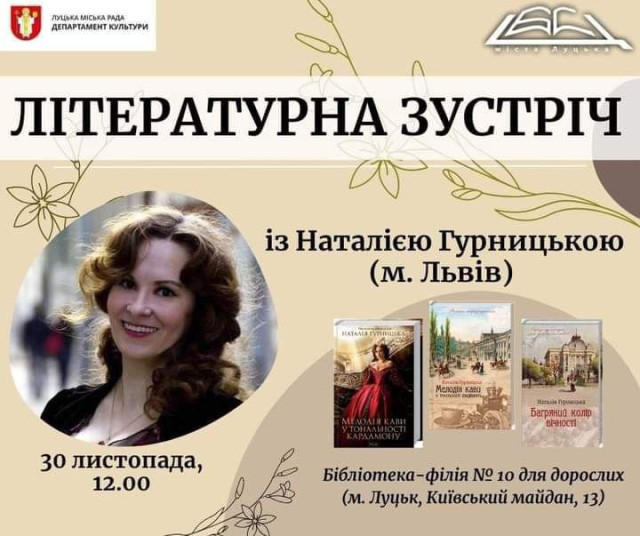 Музичний вечір «Андріївські вечорниці: від минувшини до сучасності» у Центрі туристичної інформації та послуг | 30 листопадаЛітературна зустріч із письменницею Наталією Гурницькою у бібліотеці-філії №10 для дорослих | 30 листопадаАндріївські вечорниці в «Окольному замку» | 30 листопадаMind Game Lite у бункері-броварні «Карабас-Барабас» | 30 листопадаКонцерт Академічного камерного хору «Чернівці» в Палаці культури міста Луцька | 30 листопадаЛекція «Договори для бізнесу з нуля» у центрі Дія.Бізнес | 30 листопадаМистецьке дійство «Ноосфера: симфонія добра та зла». Перформанс від Петра Антипа у музеї Корсаків | 1 грудняКомедійний трилер з елементами мелодрами «Мільйон парашутиків» у Волинському академічному театрі імені Тараса Шевченка | 1 грудняНауково-популярна лекція кандидатки історичних наук, завідувачки науково-експозиційного відділу Оксани Штанько на тему «Місто його королівської милості Луцьке: люди і влада ХVI – першої половини ХVII століття» в «Окольному замку» | 1 грудняЗустріч з ветераном російсько-української війни Олександром Тереном у музеї Корсаків | 1 грудняЛекція «Кіно як стартап» від Анни Мачух, гендиректорки Одеського міжнародного кінофестивалю у центрі Дія.Бізнес | 1 грудняКомедія «Сватання на Гончарівці» у Волинському академічному театрі імені Тараса Шевченка | 2 грудняРесурсна зустріч «Знайти порозуміння» для дружин, партнерок військовослужбовців у просторі «Плюс Плюс ++» | 2 грудняКурс із тактичної медицини у «Терновому полі» | 2 грудняВистава «жінки. війна. вірші» у просторі «Культурне укриття» | 2 грудняFitz Roy, The Emergent, Walls&Planets у «Майдані» | 2 грудняСпортивно-благодійний захід «Миколайчики, біжіть» від ТРЦ «Порт Сіті» | 3 грудняКонцерт-вистава «При ватрі» у Волинському академічному театрі імені Тараса Шевченка | 3 грудняSHUMEI у РЦ «Промінь» | 3 грудняЛекція-презентація роману «Дім солі» у книгарні «Є» | 3 грудняПерегляд документального фільму «Хроніка Української повстанської армії 1942-1954» у бібліотеці-філії №6 для дорослих | 3 грудняВистава «Чарівна лампа Алладіна» у Волинському академічному театрі імені Тараса Шевченка | 3 грудняХристина Соловій у Палаці культури міста Луцька | 4 грудняЗустріч із волонтеркою у Волинській обласній бібліотеці для юнацтва | 4 грудняТНМК у РЦ «Промінь» | 5 грудняВечір кулінарної майстерності в кафе «Срібні лелеки» | 7 грудняПодія «Скрябін. Концерт пам’яті Кузьми» у РЦ «Промінь» | 7 грудняДрама інакшості «Фрекен Жюлі» у Волинському академічному театрі імені Тараса Шевченка | 7 грудня