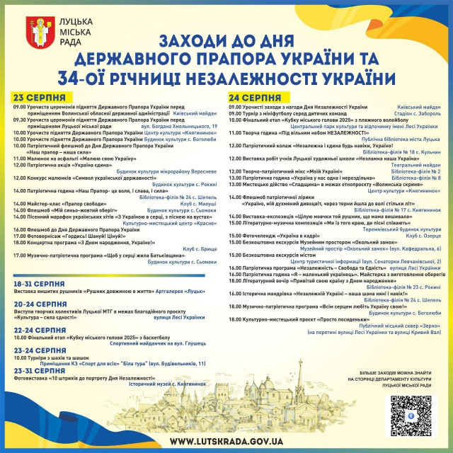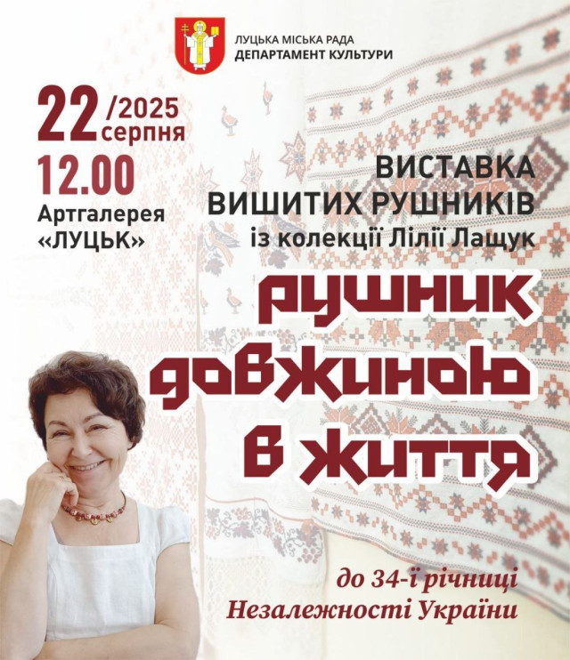 ЛЮБART FEST на «Іподромі» центрального парку | 22-24 серпняВиставка колекції рушників лучанки Лілії Лащук в артгалереї «Луцьк» | 22 серпняКонцерт гурту «БЕЗ ОБМЕЖЕНЬ» в РЦ «Промінь» | 22 серпняКультурно-мистецькі заходи до Дня Державного Прапора України та 34-ї річниці Незалежності України у Луцькій громаді | 23-24 серпняКубок міського голови з баскетболу 3×3 (спортмайданчик, вул. Глушець, 37-А) | 23 серпняКонцерт до Дня Незалежності в драмтеатрі | 23 серпняЛекція «Чому українцям XXI ст. варто пам’ятати про шляхту?». Реєстрація ТУТ | 24 серпня«Діалог з психологинею» Неонілою Кухарук на стадіоні «Авангард» | 26 серпняДжазовий Sting в Окольному замку | 27 серпняВідкрите тренування зі спортивного орієнтування у межах проєкту «Місто, рухайся!» (спортмайданчик, вул. Глушець, 37-А) | 27 серпня