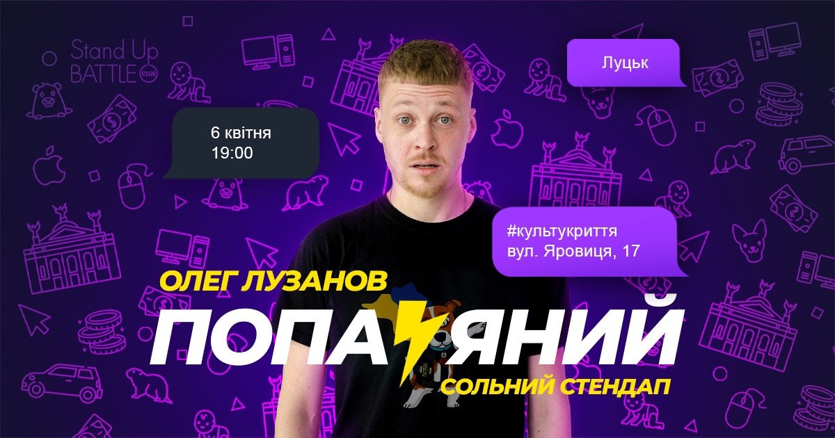 Містична фантасмагорія «Конотопська відьма» у драмтеатрі імені Тараса Шевченка | 4 квітняВистава «Колаборант» у Палаці культури | 4 квітняMind Game у бункері-броварні «Карабас-Барабас» | 4 квітняМайстерклас з виготовлення ляльки-мотанки від Pro Women UA | 4 квітняКомедія «Експеримент, або Симфонія спокуси» у драмтеатрі імені Тараса Шевченка | 5 квітняЧорна комедія «Той, що відчиняє двері» у драмтеатрі імені Тараса Шевченка | 5 квітняImprove & Stand Up – Володимир Шумко & Лєра Мандзюк у РЦ «Промінь» | 6 квітняВистава «Бджілка» в театрі ляльок | 6 квітняДрама-феєрія «Лісова пісня» у драмтеатрі імені Тараса Шевченка | 6 квітняСольний стендап Олега Лузанова «Попаяний» у «Культурному укритті» | 6 квітняДень відкритих дверей на факультеті філології та журналістики ВНУ імені Лесі Українки | 6 квітняЕкскурсії з істориком: історія кохання Івана Мазепи і таємниці аристократичної волинської сім’ї Загоровських (села Кисилин і Загорів) від Pro Women UA | 6 квітняКонцерт «Бах при свічках» у Палаці культури | 7 квітняВистава «Про що мріють зірки» в театрі ляльок | 7 квітняКомедія «Шахрайки» у драмтеатрі імені Тараса Шевченка | 7 квітняЛірична казка «Чарівна лампа Аладдіна» у драмтеатрі імені Тараса Шевченка | 7 квітняКонцерт «У барвах хорової музики» в центрі «Красне» | 7 квітняЛекція «Побудова дієвої структури компанії» в центрі Дія.Бізнес у Луцьку | 8 квітняВистава «Боїнг. Перезавантаження» у драмтеатрі імені Тараса Шевченка | 9 квітняДрама інакшості «Фрекен Жюлі» у драмтеатрі імені Тараса Шевченка | 9 квітняMemes Quiz у бункері-броварні «Карабас-Барабас» | 10 квітняЛекція «Мистецтво малих кроків: як будується бʼюті бізнес» у центрі Дія.Бізнес в Луцьку | 10 квітняВасиль Попадюк у РЦ «Промінь» | 11 квітня