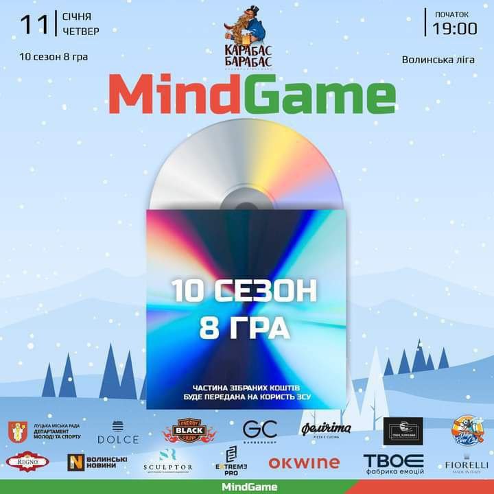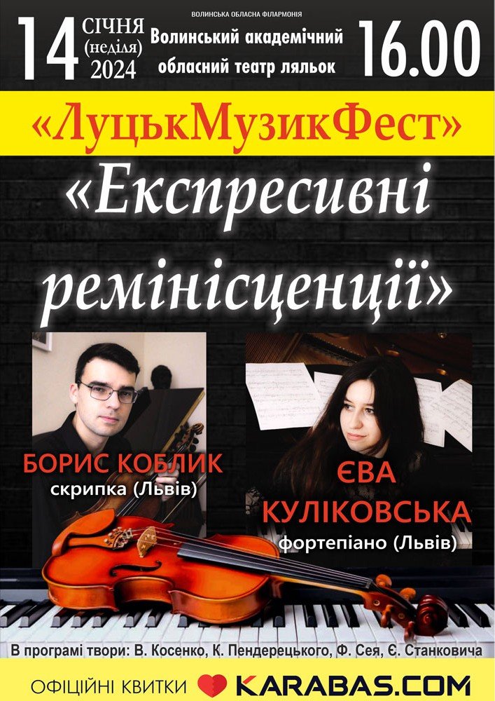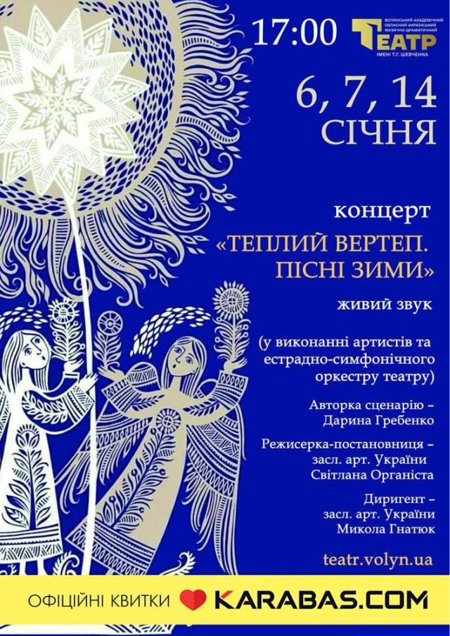 MindGame у бункері-броварні «Карабас Барабас» | 11 січняПрезентація проєкту Ірини Баковецької-Рачковської «Полісся як всесвіт» у Волинському краєзнавчому музеї | 11 січняЛекція від Ірини Новосад «Стратегічний маркетинг і PR» у центрі Дія.Бізнес | 11 січняІрина Федишин з концертом «Україна колядує» у Волинському академічному театрі імені Тараса Шевченка | 11 січняКомедійний трилер з елементами мелодрами «Мільйон парашутиків» у Волинському академічному театрі імені Тараса Шевченка | 12 січняСтарт трьохденного баблу в Луцьку | 12 січняМузична комедія «Різдвяна ніч» у Волинському академічному театрі імені Тараса Шевченка | 13 січняКонцерт органної музики в костелі Святих Апостолів Петра і Павла | 13 січняВистава «Монодії в червоному» в просторі «Культурне укриття» | 13 січняВистава «Лускунчик» у Волинському академічному обласному театрі ляльок | 13 січняКонцерт «Експресивні ремінісценції» у Волинському академічному обласному театрі ляльок | 14 січняРіздвяна казка «Піколетто» у Волинському академічному театрі імені Тараса Шевченка | 14 січняКонцерт «Теплий вертеп. Пісні зими» у Волинському академічному театрі імені Тараса Шевченка | 14 січняВистава «Велика мрія маленької ялинки»у Волинському академічному обласному театрі ляльок | 14 січняЛітературний вечір зі Степаном Геєм у Волинській науковій бібліотеці імені Олени Пчілки | 15 січняДаша Трегубова у MOJO HALL | 16 січняВистава-фентезі «Шерлок» у Волинському академічному театрі імені Тараса Шевченка | 16 січняНаціональний хор імені Григорія Верьовки у Волинському академічному театрі імені Тараса Шевченка | 17 січняДрама «Долі жіночі, або Послання від заробітчанок» у Волинському академічному театрі імені Тараса Шевченка | 17 січняКомедія «Шахрайки» у Волинському академічному театрі імені Тараса Шевченка | 18 січняКонцерт «Магія музики» у Палаці культури міста Луцька | 19 січняДрама «Не шукайте Щастя, бо я його украв» у Волинському академічному театрі імені Тараса Шевченка | 19 січня
