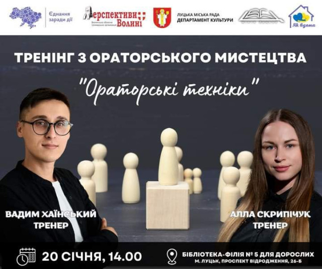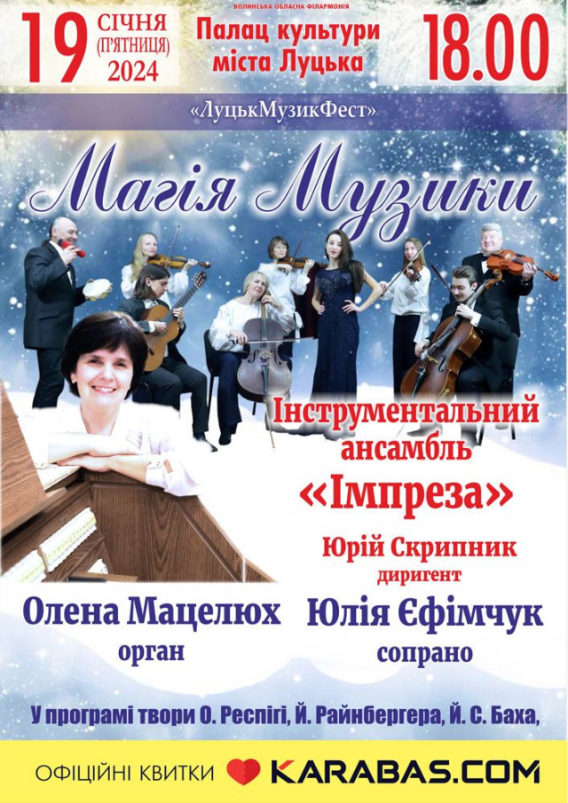 Комедія «Шахрайки» у Волинському академічному театрі імені Тараса Шевченка | 18 січняMG lite в бункері-броварні «Карабас-Барабас» | 18 січняКонцерт «Магія музики» у Палаці культури міста Луцька | 19 січняДрама «Не шукайте Щастя, бо я його украв» у Волинському академічному театрі імені Тараса Шевченка | 19 січняTayanna у РЦ «Промінь» | 20 січняТренінг з ораторського мистецтва «Ораторські техніки» в бібліотеці-філії №5 | 20 січняВистава «Пригоди Піноккіо» у Волинському академічному обласному театрі ляльок | 20 січняКомедія «Сватання на Гончарівці» у Волинському академічному театрі імені Тараса Шевченка | 20 січняЗахід «Елєганські відоси» у Молодіжному центрі Волині | 20 січняВистава від Першого академічного українського театру для дітей та юнацтва в «Експериментальному театрі Adrenalin» | 20 січняЛекція «Як написати та продати сценарій» сценариста і режисера Павла Євчука в центрі Дія.Бізнес | 20 січня«Державна зрада» у Волинському академічному театрі імені Тараса Шевченка | 20 січня«Лісовий цирк» у Волинському академічному обласному театрі ляльок | 21 січняПоетична замальовка «ЩеМить» у бібліотеці-філії №10 | 21 січняМюзикл для дітей «Попелюшка» у Волинському академічному театрі імені Тараса Шевченка | 21 січняІрина Федишин із програмою «Україна колядує» у Волинському академічному театрі імені Тараса Шевченка | 22 січняГра-симулятор «Світ громад» у Молодіжному центрі Волині | 22 січня