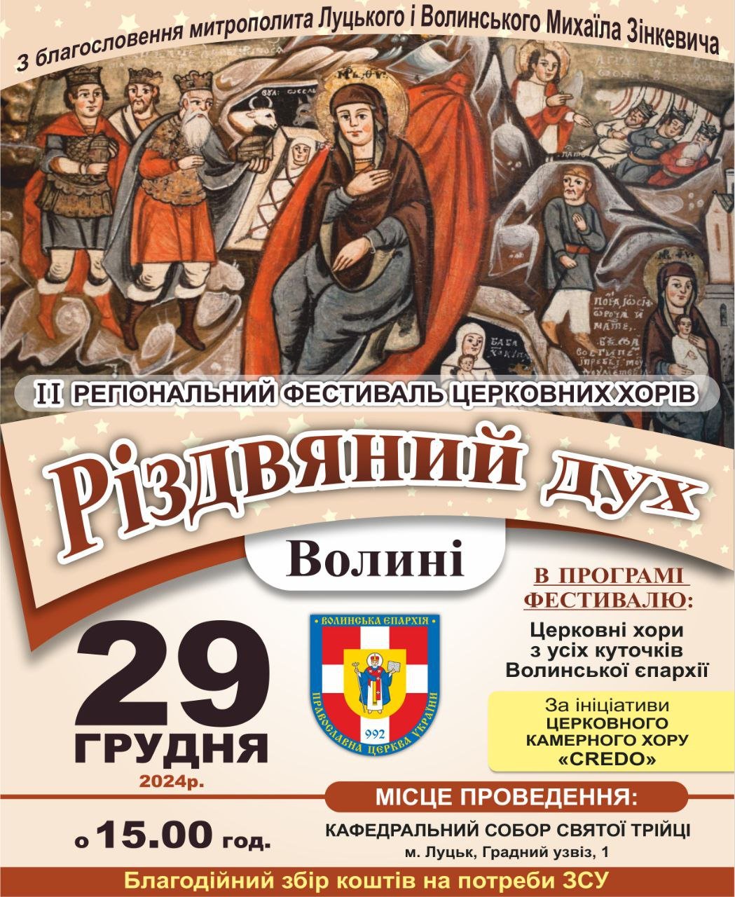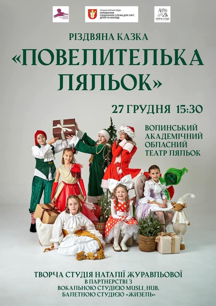Різдвяно-новорічні заходи в Луцькій громаді | протягом грудня-січняВолинський народний хор з концертом «У Вифлеємі радість стала…» в драмтеатрі імені Тараса Шевченка | 26 грудняWinter Anime&K-Pop Fest у РЦ «Промінь» | 26 грудняДрама «Не шукайте щастя, бо я його украв» в драмтеатрі імені Тараса Шевченка | 26 грудня«Новорічно-акустичний вечір» у Волинському молодіжному центрі | 27 грудняВистава «Повелителька ляльок. Різдвяна казка» в театрі ляльок | 27 грудняРіздвяна вечірка в Музейному просторі «Окольний замок» | 27 грудняРіздвяний концерт у Палаці культури | 27 грудняВистава «Велика мрія маленької ялинки» в театрі ляльок | 28 грудняМузична комедія «Різдвяна ніч» у драмтеатрі імені Тараса Шевченка | 28 грудняНоворічна казка «Закоханий друг Святого Миколая і Санти» в драмтеатрі імені Тараса Шевченка | 29 грудняКонцерт «Теплий вертеп. Пізні зими» в драмтеатрі імені Тараса Шевченка | 29 грудняФестиваль «Різдвяний дух Волині» в кафедральному соборі Святої Трійці | 29 грудняБлагодійний новорічний забіг у центральному парку | 29 грудняКонцерт «Різдвяний джаз при свічках» у драмтеатрі імені Тараса Шевченка | 30 грудняВідкриття виставки Анатолія Ганкевича «Ніч у раю» в Музеї Корсаків | 3 січня«Тренди б’юті-бізнесу 2025» лекція Ірини Похільчук у центрі Дія.Бізнес у Луцьку | 3 січня