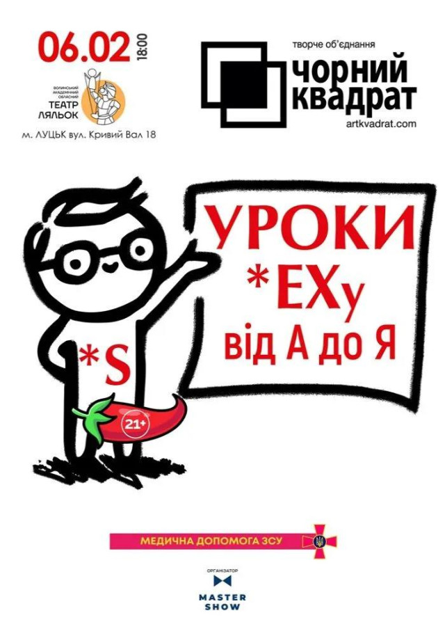 Комедія «Як виростити чоловіка в домашніх умовах» у драмтеатрі імені Тараса Шевченка | 30 січняМелодраматична комедія «Замовляю любов» у драмтеатрі імені Тараса Шевченка | 31 січняТоня Матвієнко в комплексі Gosti | 31 січняКонцерт волинського гурту «Потойберег» | 31 січняПрактичний семінар «Мистецтво і ментальне здоров’я: Арттерапія як ресурс відновлення» в Музеї Корсаків | 31 січня – 2 лютогоВистава «Снігова королева» в театрі ляльок | 1 лютогоGonzo Party в MIK Studio | 1 лютогоВистава «Рукавичка» в театрі ляльок | 1 лютогоМузична комедія «Хай живе любов» у драмтеатрі імені Тараса Шевченка | 1 лютогоЗустріч у Молодіжному центрі Волині | 1 лютогоМузична казка-фентезі «Аліса. Повернення в Дивокрай» у драмтеатрі імені Тараса Шевченка | 2 лютогоВистава «Загублене свято» в театрі ляльок | 2 лютогоПсихологічно-коучингова гра-тренінг «PROFорієнтир». Реєстрація тут | 2 лютогоВистава «Зоряні колисанки» в театрі ляльок | 2 лютогоКомедія «Шахрайки» у драмтеатрі імені Тараса Шевченка | 2 лютогоКомедія «Третій зайвий» у драмтеатрі імені Тараса Шевченка | 4 лютогоКомедійний трилер з елементами мелодрами «Мільйон парашутиків» у драмтеатрі імені Тараса Шевченка | 5 лютогоВистава для дорослих «Малена. Смак гріха» у драмтеатрі імені Тараса Шевченка | 5 лютогоПрезентація фентезі «Вовчі землі» в книгарні «Є» | 5 лютогоВистава театру «Чорний квардат» під назвою «Уроки сексу від А до Я» в театрі ляльок | 6 лютого